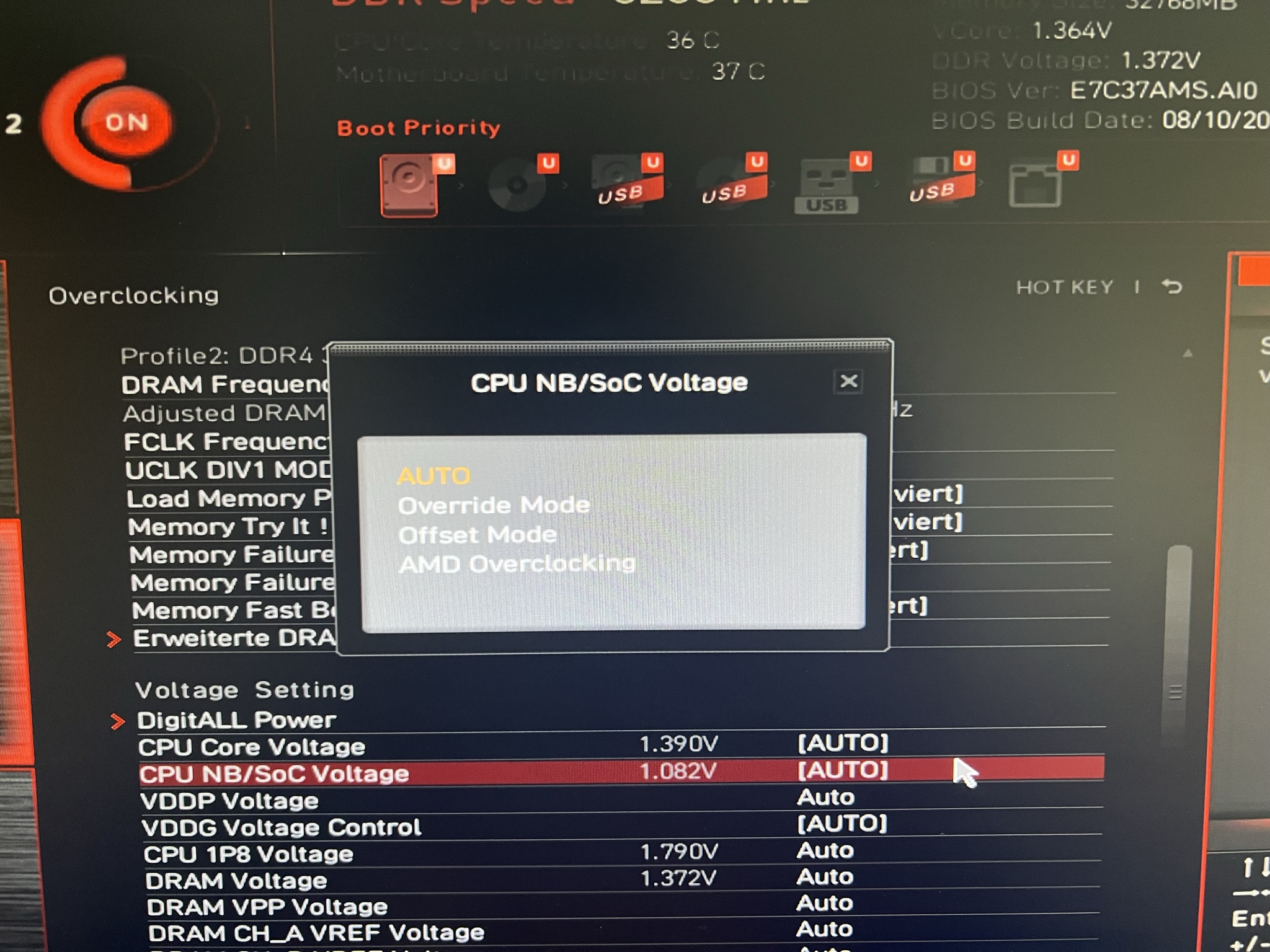 So viele Einstellungsmöglichkeiten habe ich bei meinem Board nicht, aber Override Mode sollte bei MSI schon die richtige Option sein. Ich weiß nicht, wie häufig (und vor allem reproduzierbar!) deine Probleme sind, aber bitte geduldig sein auch wenn es etwas länger dauern kann. So min. ein oder zwei Wochen ohne irgendwelche Auffälligkeiten. Selten und zufällig wie bei mir war wirklich die undankbarste Kombination, am Ende war es jedoch tatsächlich die VSoC...