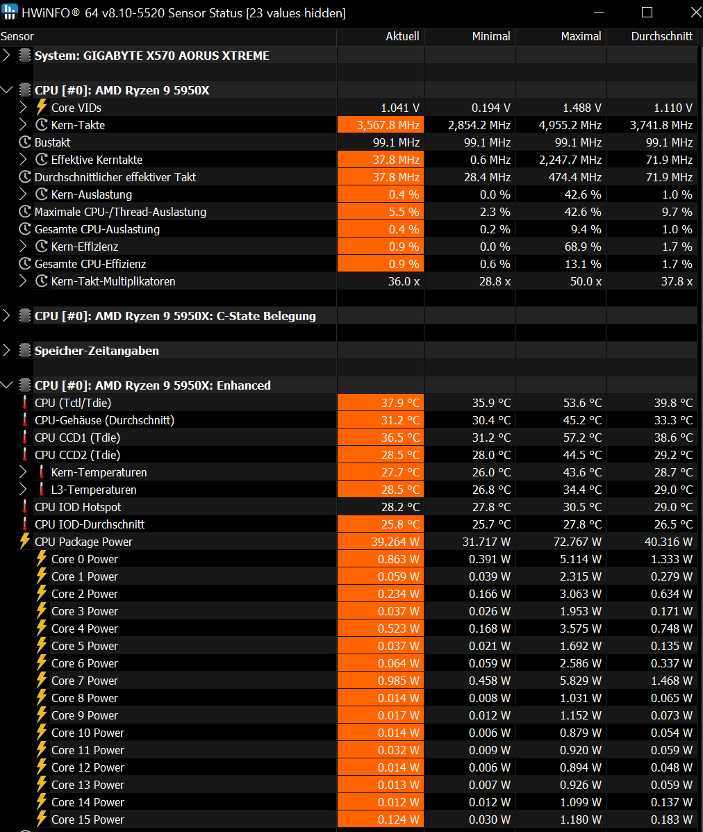 Das ist schon sehr komisch, wird aber wahrscheinlich mit der ominösen Auslastung der zwei Cores zu tun haben.Ayo34 schrieb:62 Watt CPU Last ist ja schon mittlere Last. Mein ganz Rechner mit 5800x + 4080 verbraucht nicht so viel Strom wie bei dir alleine die CPU im Idle.
