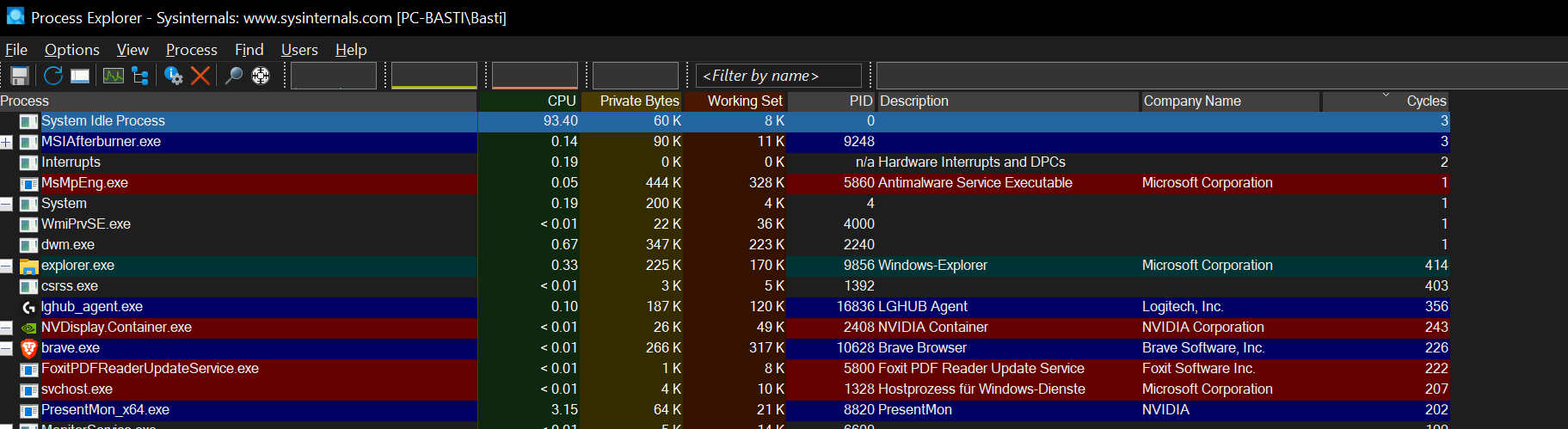 Also bei mir ändert sich die Sortierung nicht. Ich habe die procexp64.exe gestaretet, oben in die Leiste geklickt und im Menü unter "Process Performance" dann CPU Cycles ausgewählt, dass er mir das anzeigt, dann hab ich auf "Cycles" geklickt für die Sortierung. Bleibt aber von den Werten identisch.qiller schrieb:Edit: Bei dir ist auch die Sortierung nicht korrekt, vlt. nochmal draufklicken.