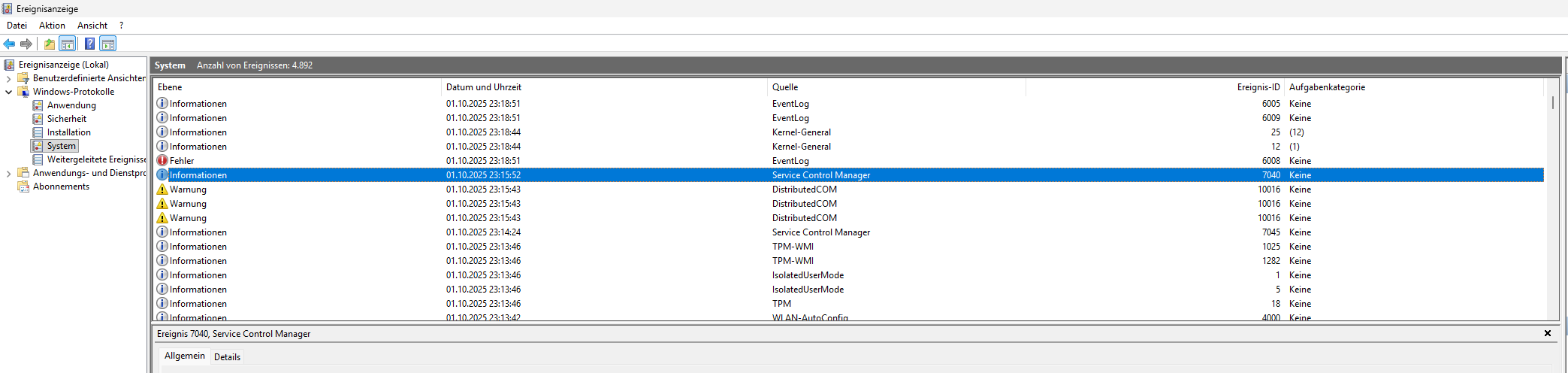 Dann den Bereich Windows-Protokolle aufklicken dort zu System wechseln.