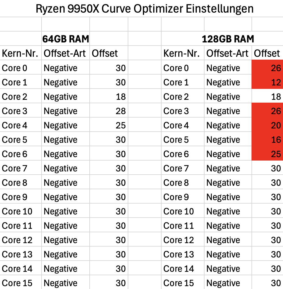 Ich habe mir Ende 2024 einen neuen Unterbau bestehend aus Ryzen 9950X, ASUS X670E Pro Art Creator WiFi und 4x 32GB Corsair CMK64GX5M2B6600C32 gegönnt, von denen allerdings zunächst aus Performancegründen nur 64GB verbaut wurden. Die CPU wurde mittels Core Cycler best-möglich optimiert, wobei sich die meisten Kerne mit einem negativen Offset von 30 betreiben ließen. Vor einigen Wochen habe ich dann die zweiten 64GB eingebaut in der Hoffnung, dass das mit neuestem BIOS besser funktioniert (hats glücklicherweise