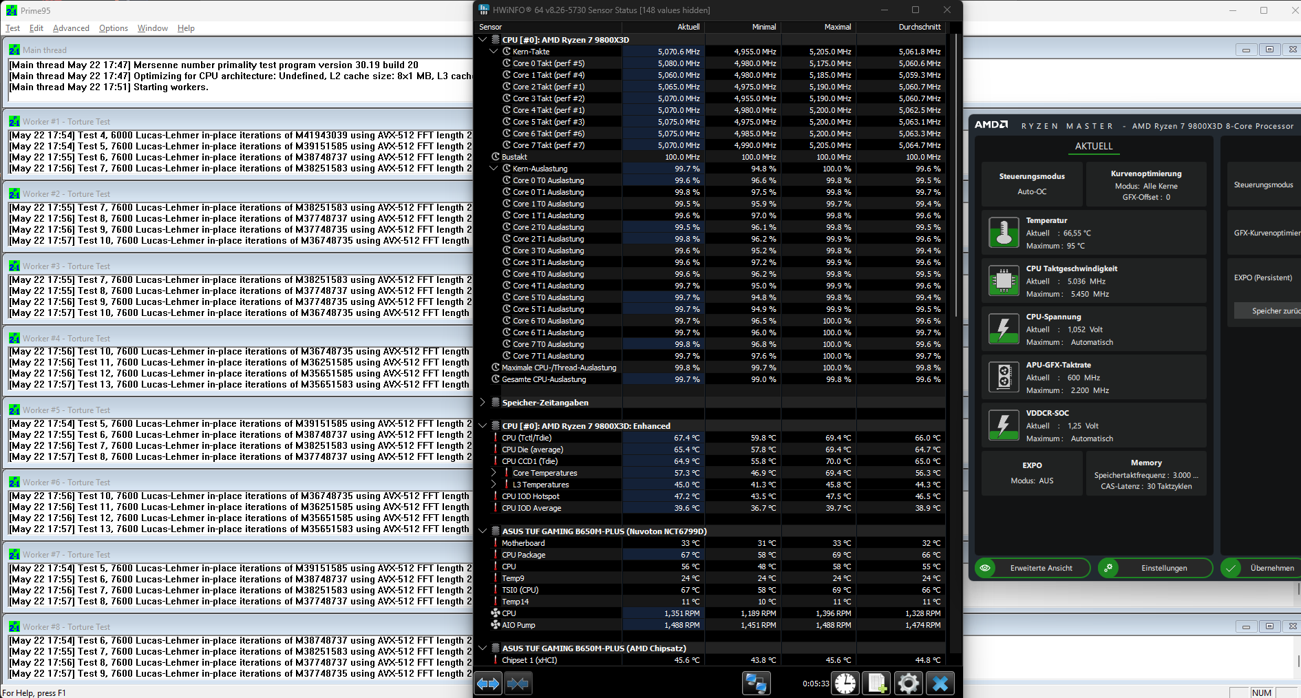 Nochmal genauer angesehen: Hier sieht man nun zumindest den zu erwartenden Takt von 5,2 GHz. Das Ergebnis für den Einzeldurchgang nach Abkühlen sollte auch näher an den 1359 dran sein als die zuvor gemessenen 1272 Punkte. Dass der Takt mit Prime niedriger ausfällt, ist unter diesen Bedingungen in Ordnung. Nur die 93,5°C im Cinebench sind immer noch zu hoch.BAR86 schrieb:Und hier nochmal Cinebench