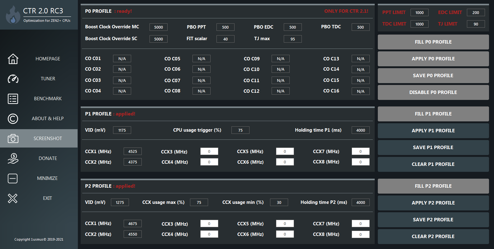 VID 1175, CCX1 3825, CCX2 3775, CPZ usage trigger 75%, holding time 4000