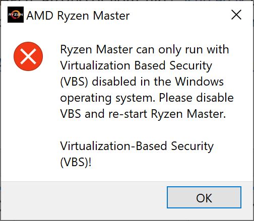 Ryzen Master can only run with Virtualization Based Security (VBS) disabled in the Windows operating system. Please disable VBS and re-start Ryzen Master. Virtualization-Based Security (VBS)!