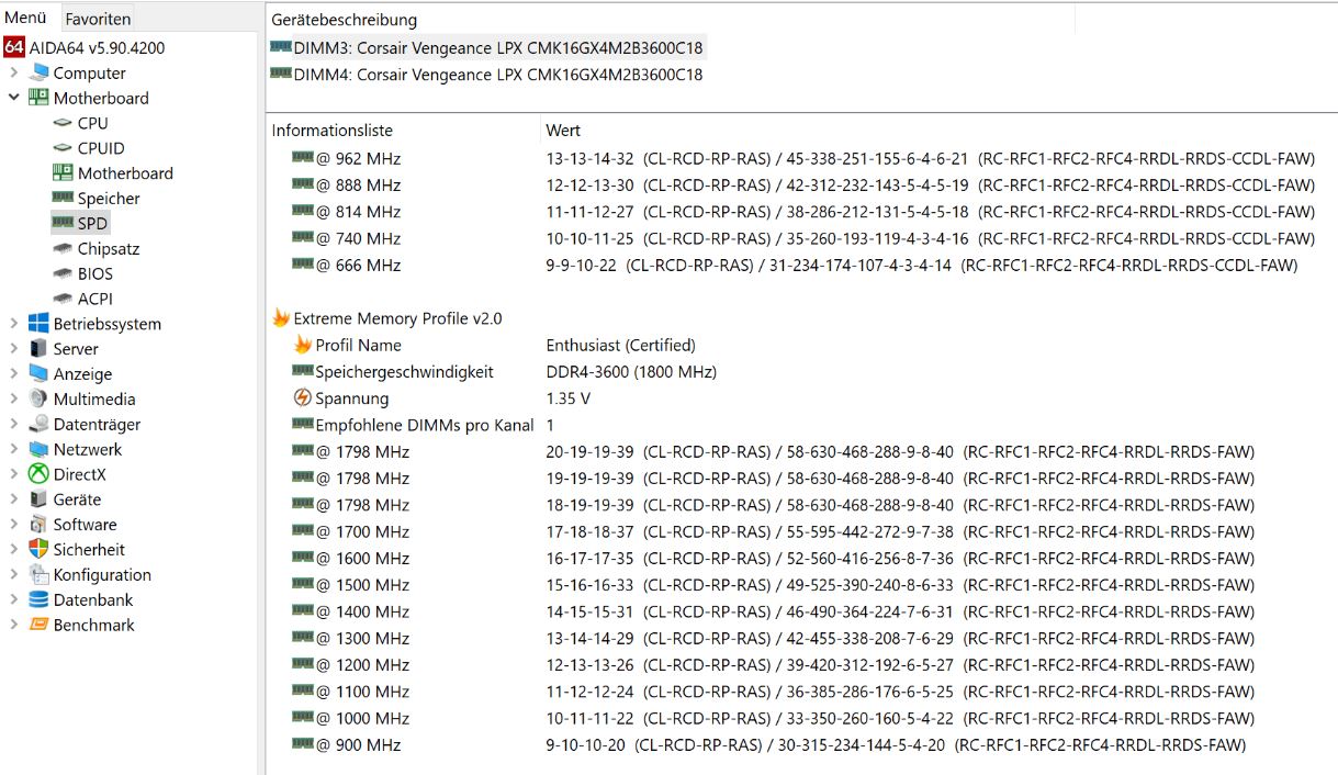 Ja gerne. Der Speicher ist unter dem Reiter Motherboard und dann SPD auswählen. Dort findet man im Abschnitt Extreme Memory Profile die Timings für den Riegel die der Hersteller bei den verschiedenen Taktunken 1800 - 3600 MHz vorgesehen hat. Aber aufpassen ist immer die Hälfte des Takts angegeben wegen DDR heißt ja Doppelte Datenrate. ;-)