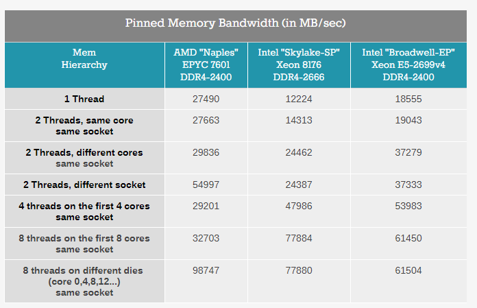 Meanwhile a single thread on a Naples core can get 27,5 GB/s if necessary. This is very promissing, as this means that a single-threaded phase in an HPC application will get abundant bandwidth and run as fast as possible. But the total bandwidth that one whole quad core CCX can command is only 30 GB/s.