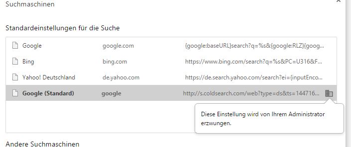 Ich habe dann mal in den Einstellungen für meine Standardsuchmaschine nachgeschaut und da ist nicht mehr Google.com hinterlegt, sondern "Google (Standard)" mit einer Verlinkung zu dieser ominösen "s.coldsearch.com" und ich kann die Suchmaschine auch plötzlich nicht mehr ändern, weil diese Einstellung vom Admin erzwungen wird.