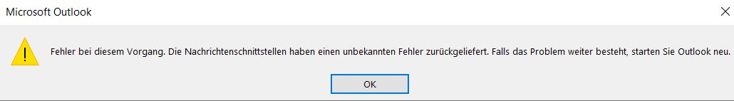 "Fehler bei diesem Vorgang. Die Nachrichtenschnittstellen haben einen unbekannten Fehler zurückgeliefert. Falls das Problem weiter besteht starten Sie Outlook neu."