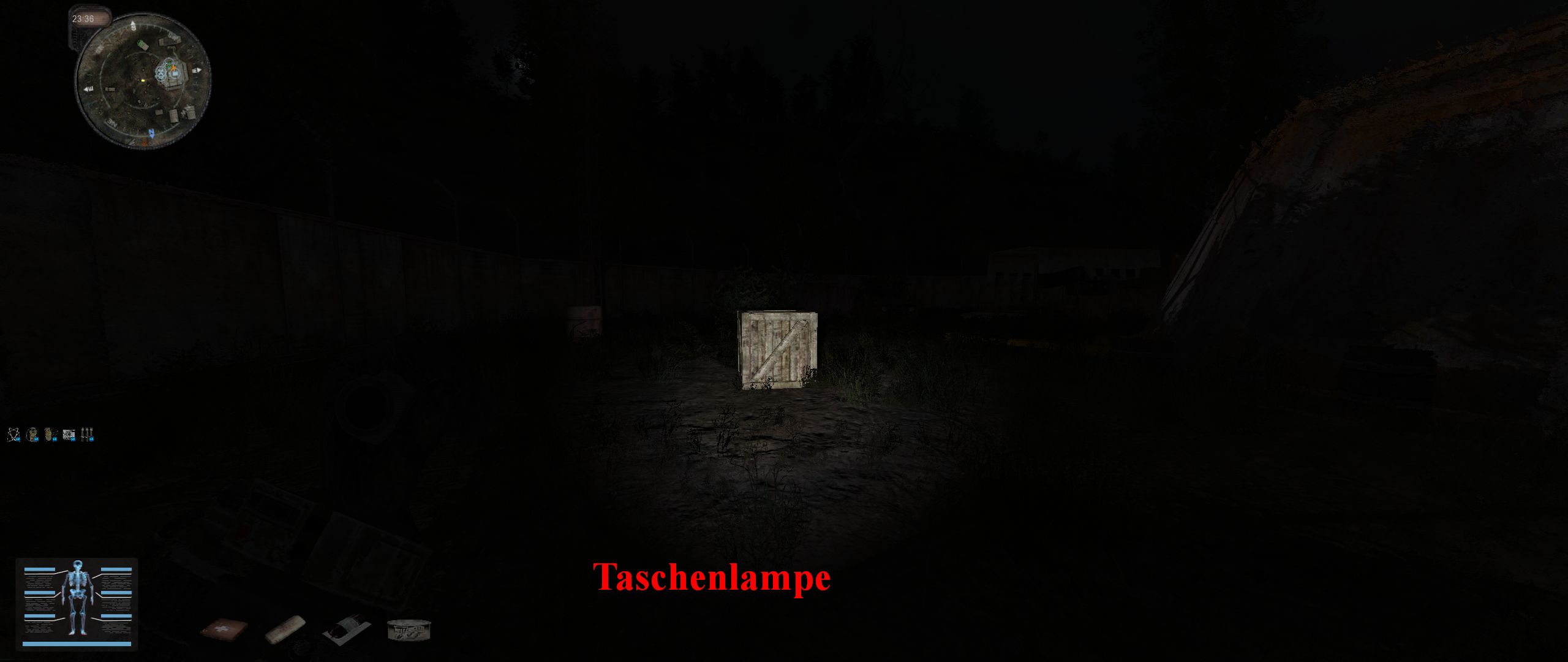 @cyberpirate: hast Du die Lampe auch in deinem Menü aktiv drinnen stehen? Nur im Rucksack zu transportieren reicht nicht aus. In diesem Slot befindet sich ENTWEDER der Scanner ODER die Lampe oder das Radio etc... Ausgenommen du hast schon die Stirnlampe, diese hat einen eigenen Slot oben rechts.
