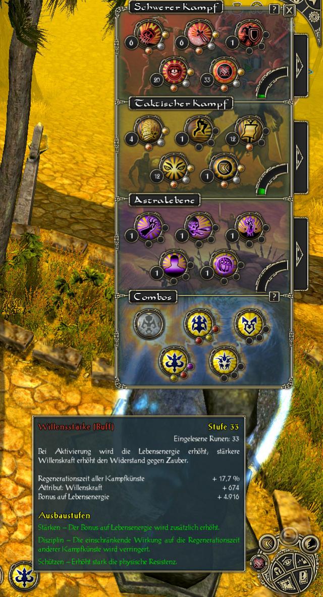 Kann mal selbsterklärend per Drag & Drop dort zusammenbauen, wo man die Kampfkünste findet. Bei einer Combo ist die KK mit der höchsten Regenerationszeit relevant. Hast Du also eine Combo, bei der die 1. KK sagen wir 2,4s zum Regenerieren braucht und die 2. KK nur 1,8s, dann hat die Combo eine Reg-Zeit von insgesamt 2,4s.
