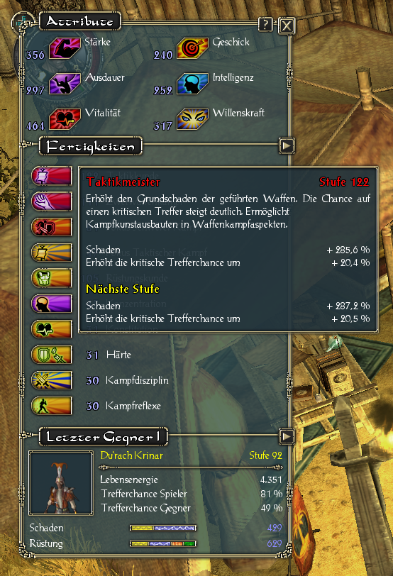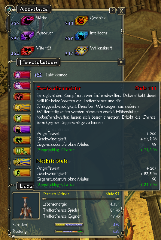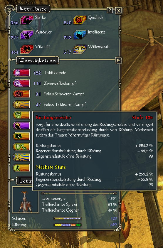 Dann hab ich noch "Schildkunde" und "Rüstungskunde", "Konstutition", "Härte" und Taktikkunde für die kritischen Treffer.