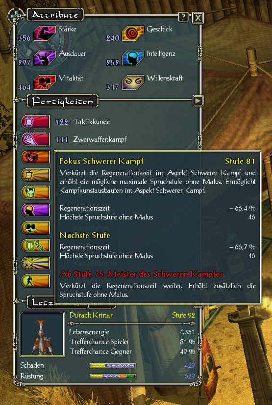 Ich spiele einen Nahkampf-Zweiwaffen-Schattenkrieger, so dass ich erst einmal Taktikkunde, Zweiwaffenkampf und Rüstungskunde immer auf meinem aktuellen Level gehalten habe. Bin jetzt Level 79 und somit Taktikkunden, Rüstungskunden bzw. Zweiwaffenkampfmeister. Jetzt werde ich meine beiden Foki auf 75 bringen. Zudem habe ich noch Konstitution, Härte, Kampfreflexe, Kampfdisziplin und Konzentration geskillt. Mal sehen, was sich davon noch lohnt, auf 75+ gepusht zu werden.