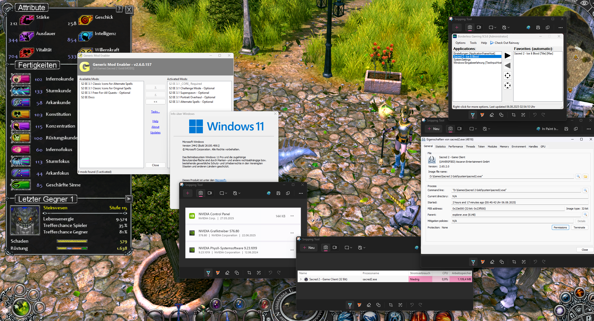 Hier mal ein Screenshot vom Spiel mit allerhand Infos oben drauf. Man sieht: alles was von Nvidia installiert ist, das Borderless Tool, das Mod Tool, Arbeitsspeicher Auslastung laut Windows 11 Task Manager und eine Info vom Process Explorer.