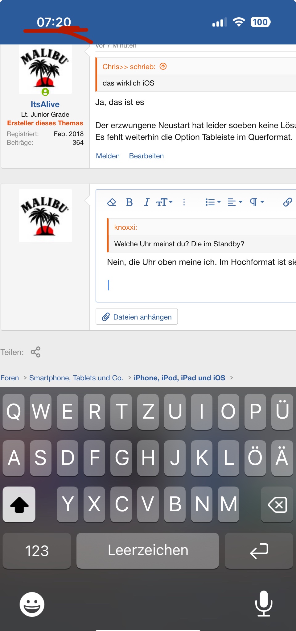 Habe das Gerät ebenfalls schon neugestartet, da ich auf einer Appleseite laß, dass man dies tun solle (war ein Comunity Forum).