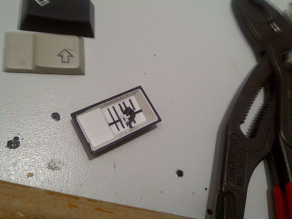 So, weiter geht es mit dem zurechtbasteln der Feststelltaste. Da die bisherige Aufnahme im Weg war, mußte die weg. Dann wie bei der Leertaste die Aufnahme aus einer anderen Tastenkappe raussägen und reinkleben.