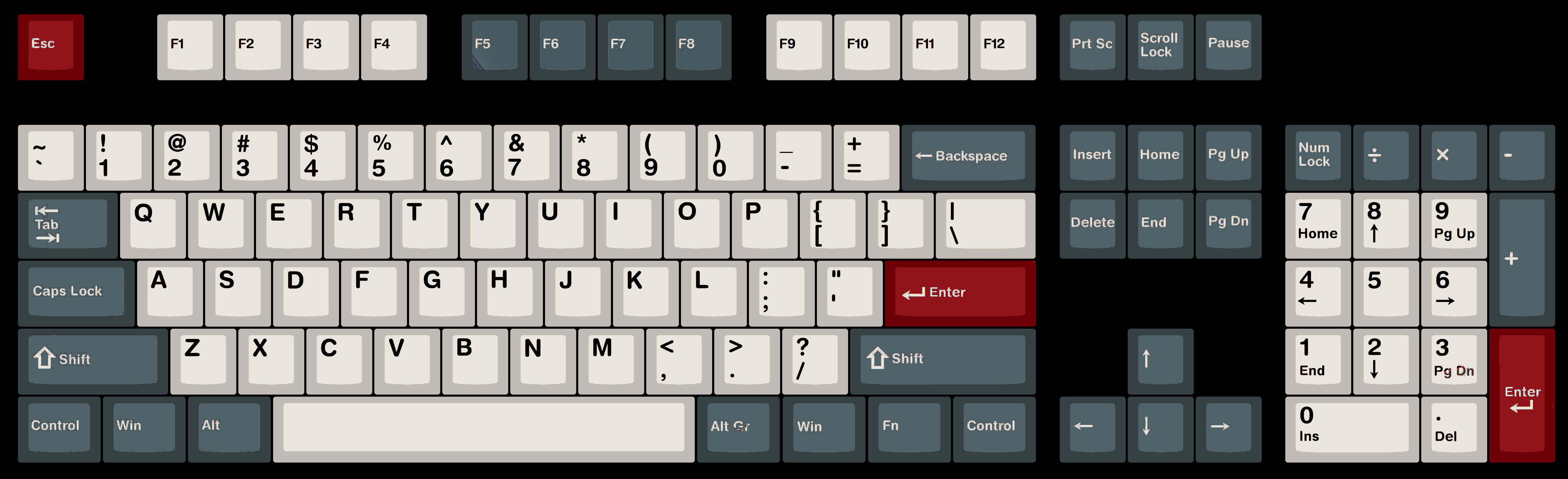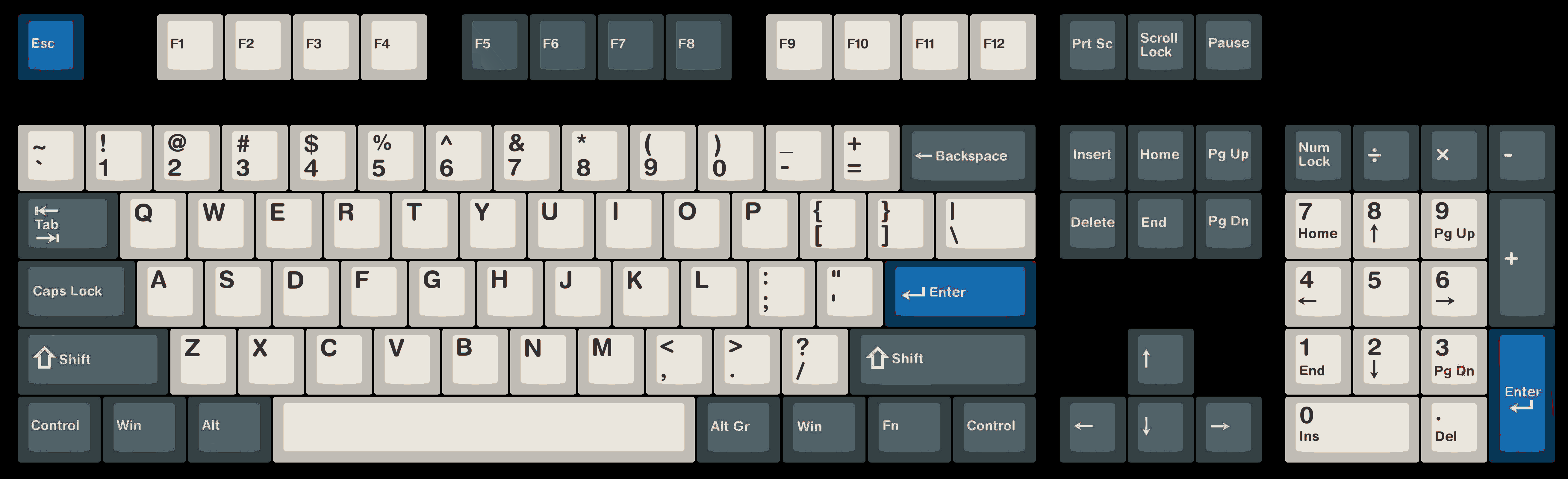 Bezüglich meines Entwurfs und den Farben dachte ich an Folgendes: Alphas/Helle F-Tasten: Cap: L9 Font: N9 Mods: Cap: Custom (BlauGrau) Font: L9 (wie Alphas) Esc/Enter: Cap: P3 Font: L9 (wie Alphas)