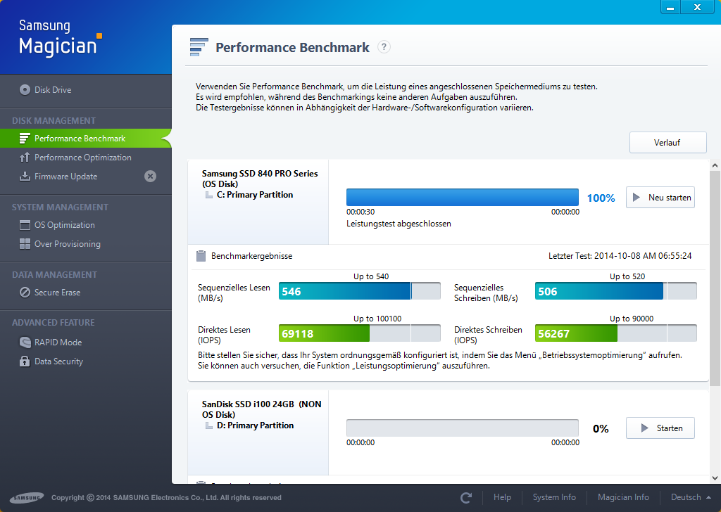 Samsung Magican bei 0% Fragmentierung (Leistungsmodus):