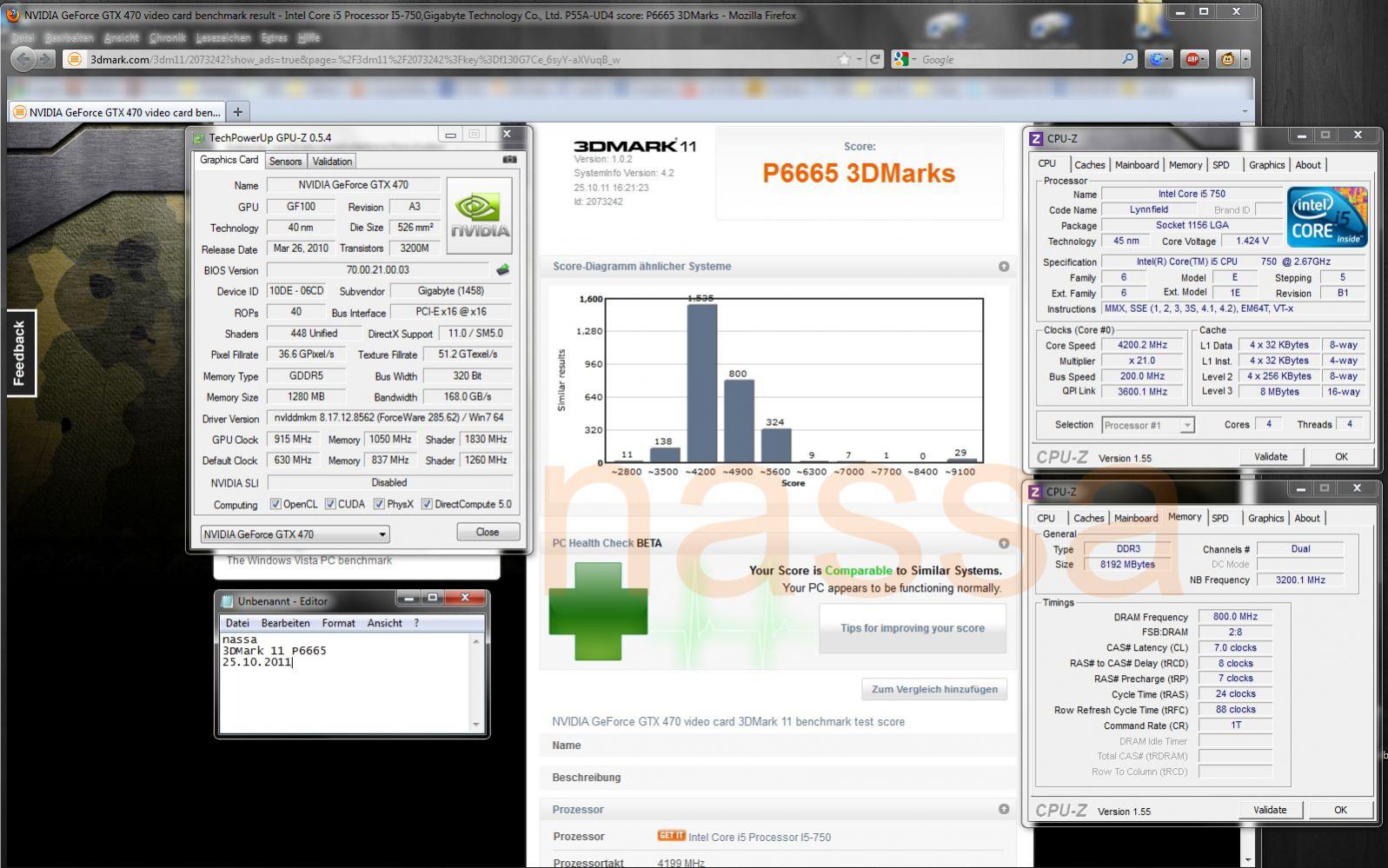 dedavid95 | 4263P. | Intel i7-870 | 4092MHz | Palit GTX 460 2GB | 849MHz | 2010MHz | Screen | 3DMark11