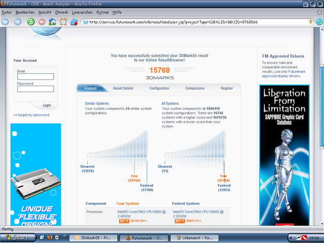 CPU:Core2Duo E 6300@3,15GHz RAM:2GB Corsair XMS2 PC2-800MHz@900MHz@5-5-5-15(statt4-4-4-12) Graka:Gigabyte 8800GTX@650/1060MHz(Treiber 158.22) Mobo:Gigabyte P965-DS4 Rev3.3 OP:Windoes XP Proffesional Service Pack 2