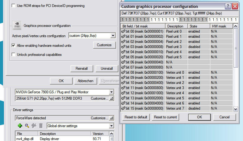 Ausserdem ist mir aufgefallen: auch wenn sich die 20 Pixel-Units und 7 Vertex-Units von der Geforce 7900GS mit dem Rivatuner nicht "sichtbar" auf 24pp/8vp erhöhen lassen aber man die Einstellung trotzdem vornimmt und damit bencht, bekomme ich 500 Punkte im 3DMark06 mehr. Ein wenig seltsam, ich finds aber geil