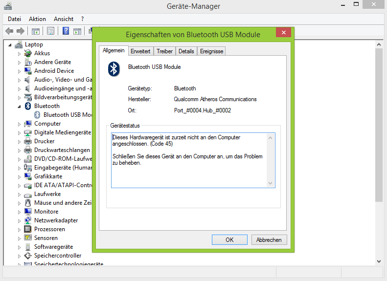 ich wollte heute zum ersten Mal ein Bluetooth-Gerät mit meinem V5 573g koppeln. Anscheinend funktionieren die Treiber aber nicht. Das Bluetooth-Gerät wird weder im Geräte-Manager noch unter Netzwerke angezeigt.. Auch nicht bei den ausgeblendeten Geräten im Geräte-Manager. Auch die Neuinstallation des Atheros-Treibers brachte keine Hilfe. Hat jemand einen Tipp für mich?