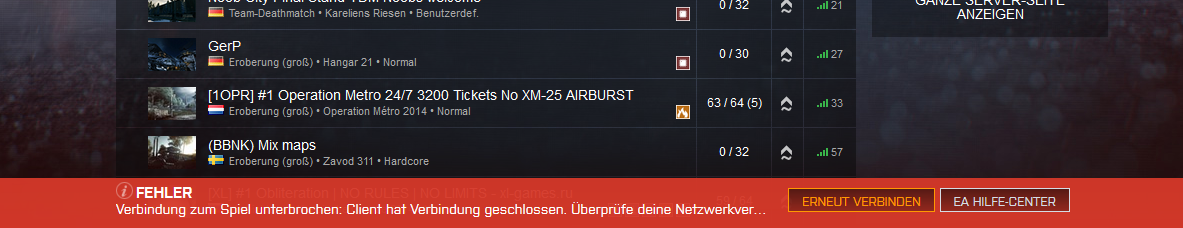 Habe seit paar Tagen das Problem dass ich mitten im Spiel mit schwarzen Bildschirm aus dem Spiel geworfen werde mit der Meldung "Es ist ein Fehler aufgetreten! Verbindung zum Server wurde unterbrochen"