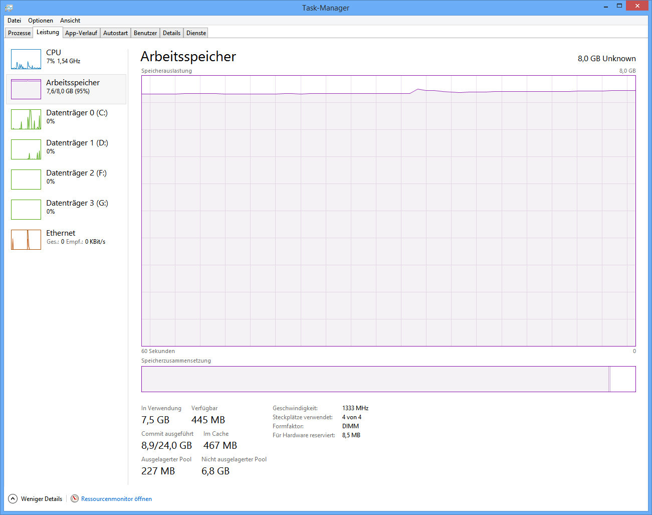 Ich hab das Problem, dass sich während des Online spielens der RAM (8 GB) ohne ersichtlichen Grund vollkommen füllt und selbst nach dem Beenden von BF4 voll bleibt (siehe Screenshots). Abhilfe schafft nur ein Neustart des PCs.