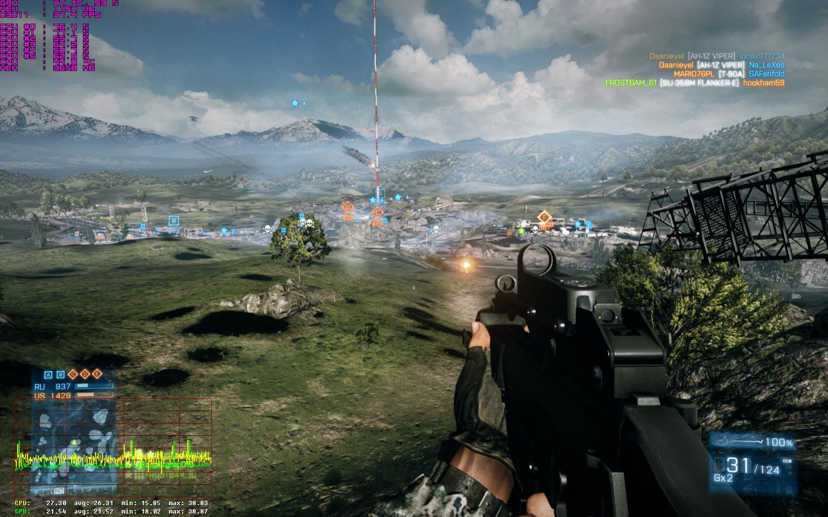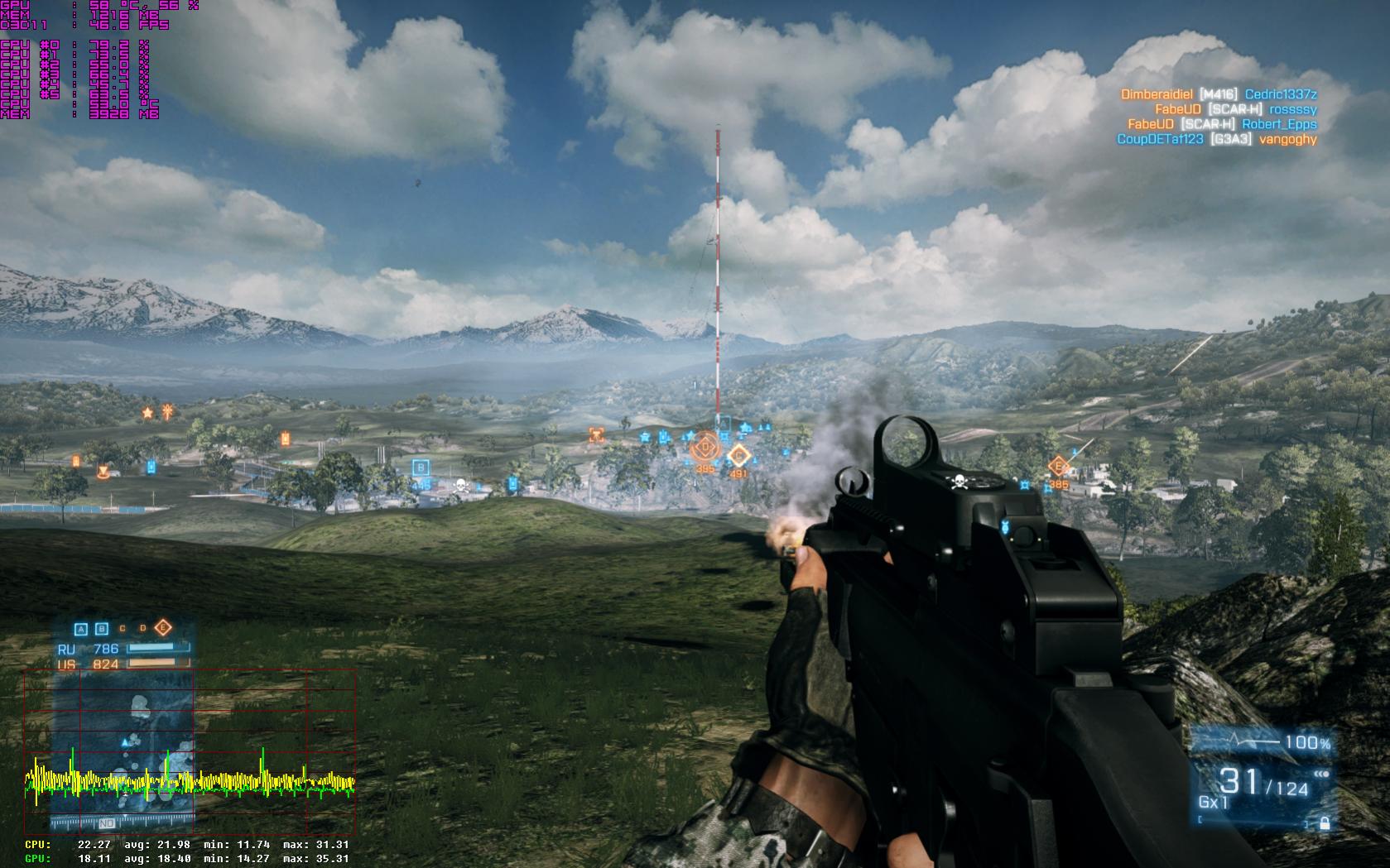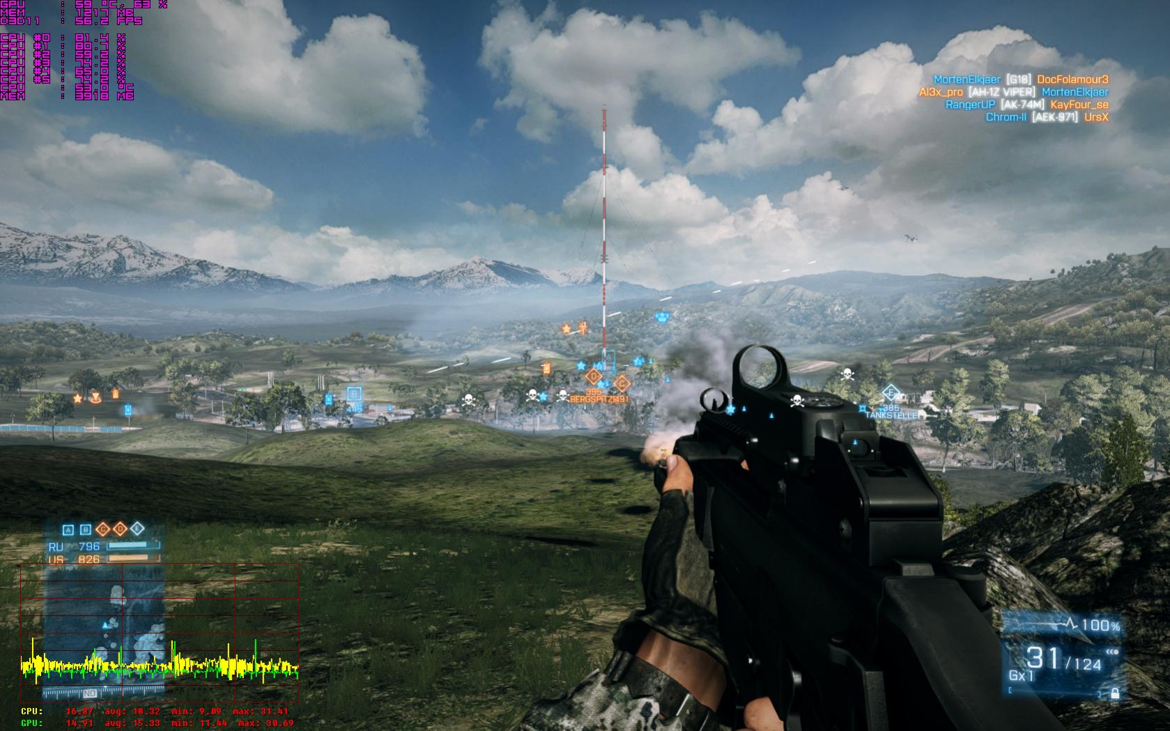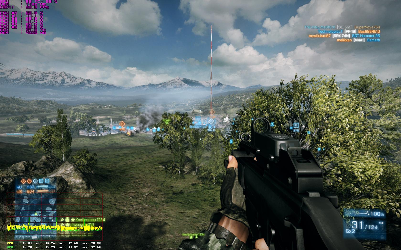 so, hier ein erster Test: zur besseren Vergleichbarkeit habe ich alle Bildverbesserer genauo gelassen wie vorher: Vsync aus, 4xMSAA, FXAA mittel, 16xAF, SSAO (so gefällt mir persönlich das Bild optisch am besten).