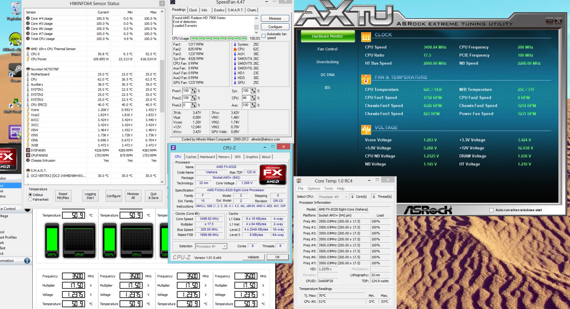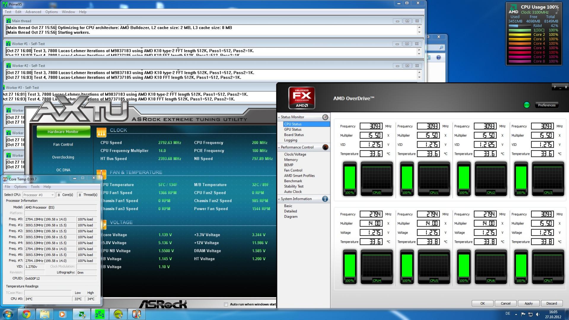 ich habe einen AMD FX 8120 8x 3,1 GHz. Mein Problem ist nun, wenn ich Prime95 laufen lasse, habe ich unterschiedliche Temperaturen in unterschiedlichen Programmen. Wie man auf dem Bild sieht, hat CoreTemp und AMD OverDrive bei Prime95 eine Temperatur von ~30° und gleichzeitig der ASRock eXtreme Tuner eine Temperatur von ~58°.