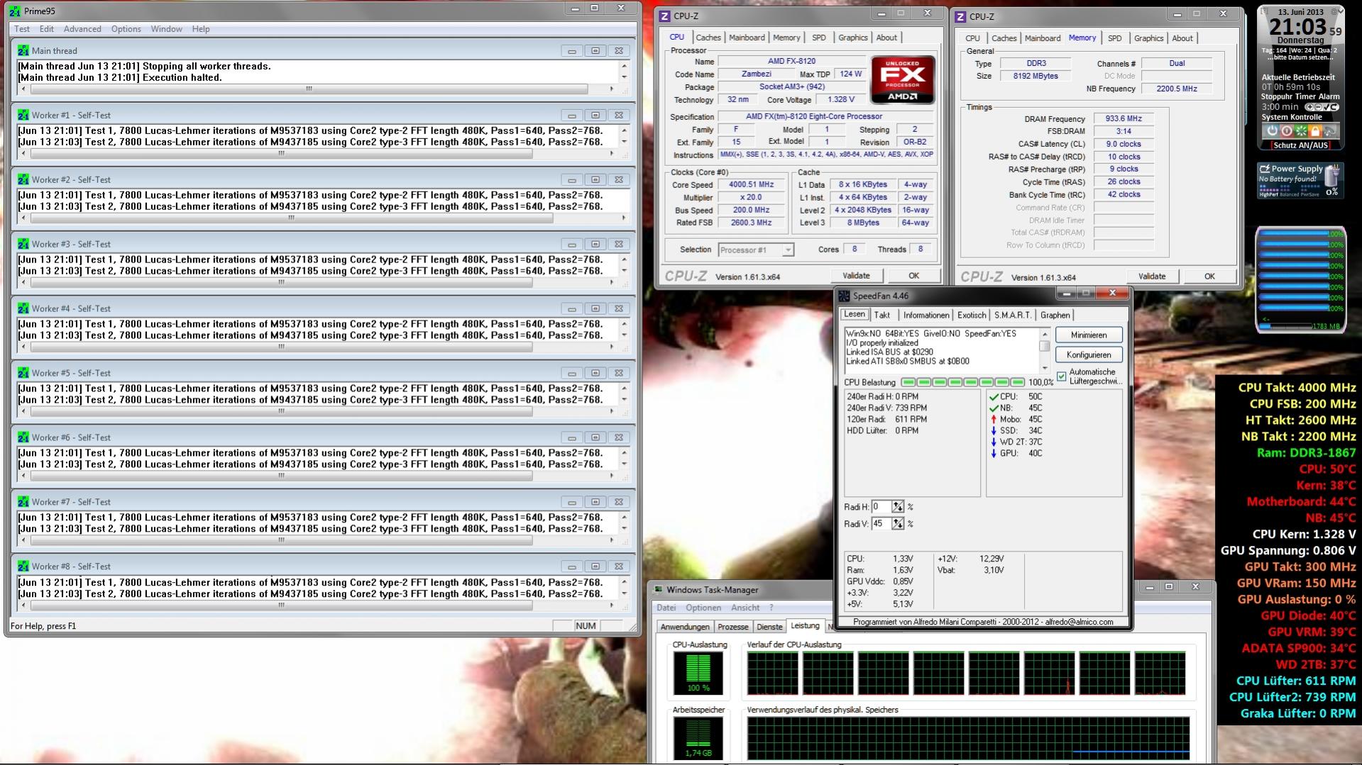 Casi030 schrieb:Das schaut gut aus,jetzt lässt mal Prime (In place Large FFTs)rund 15 min laufen und machst dann unter Primelast nen Screen von den Temps, Programmen sollten zu sehen sein: SpeedFan,TaskManager(Leistung um die Auslastung zu sehen)CPUz...CPUz kannst 1000x öffnen.Sehen würd ich gerne CPU und Memory davon.