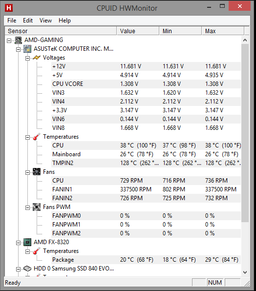 Der Kühler wird zwar auch warm, jedoch nicht so heiß wie die heatpipe von den spannungswandlern am board, was nach meiner theorie die obere temp anzeige ist.