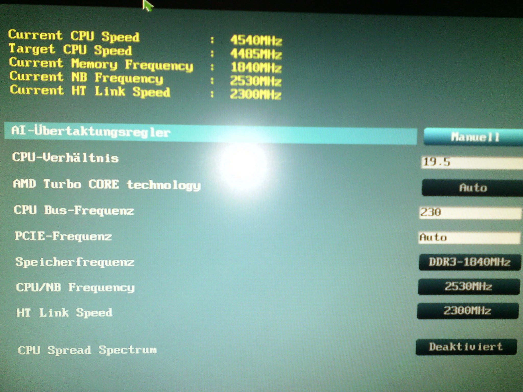 Um dass max an Takt für deinen Speicher erst einmal zu ermitteln, nimm den den Multi soweit runter, dass die CPU untertaktet ist (Spannung so lassen, Stromsparmodies alle aus lassen), HT und CPU NB den Multi auf unter 10, halt Untertakten. Ja und dann kannst du den BCLK Stück für Stück hoch nehmen, bis du nicht mehr in Windows kommst, dann kannst du vielleicht noch die Spannung hoch nehmen (1,65V). Schau, wie weit du kommst, je nach dem, wie hich dann dein BCLK ist, musst du dann ein Kompromiss finden zwischen CPU Takt und RAM Takt (so um die 4,5 GHz)
