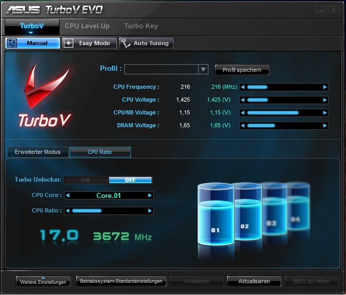 ich hab mich nun auch mal mit übertakten versucht (Phenom II 940 BE, 4x3 Ghz, 2 Jahre alt). Aber ohne die Spannung zu erhöhen schafft der Prozessor keine 3.4 Ghz. In Prime95 ist mir der Rechner bei 3.4 Ghz mit Bluescreen abgestürzt.