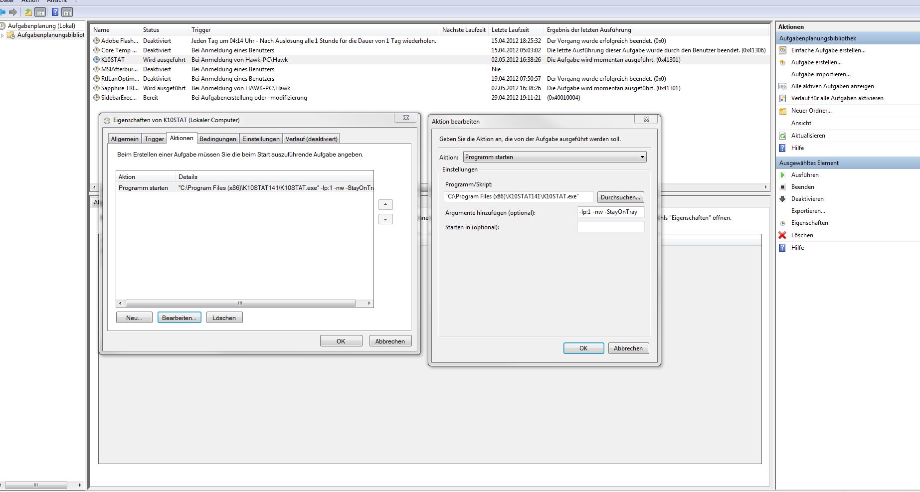 k10stat benötigt zum Start Administrator Rechte, deshalb muss man über die Aufgabenplanung gehen, denn nur dort kann man einem Programm die nötigen Rechte mitgeben. Allerdings wird k10stat dann nicht als Tray-Icon angezeigt. Es ist aber in der Liste der laufenden Prozesse zu finden (dort muss man sich über den Administrator Knopf alle Prozesse anzeigen lassen) und ist auch aktiv.