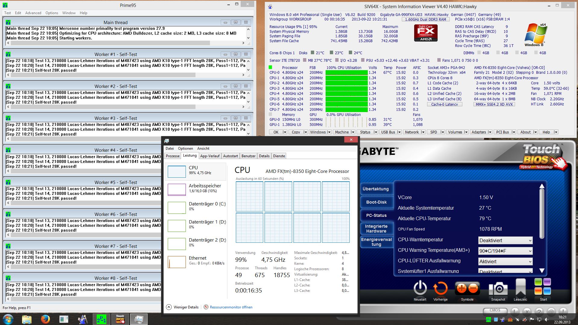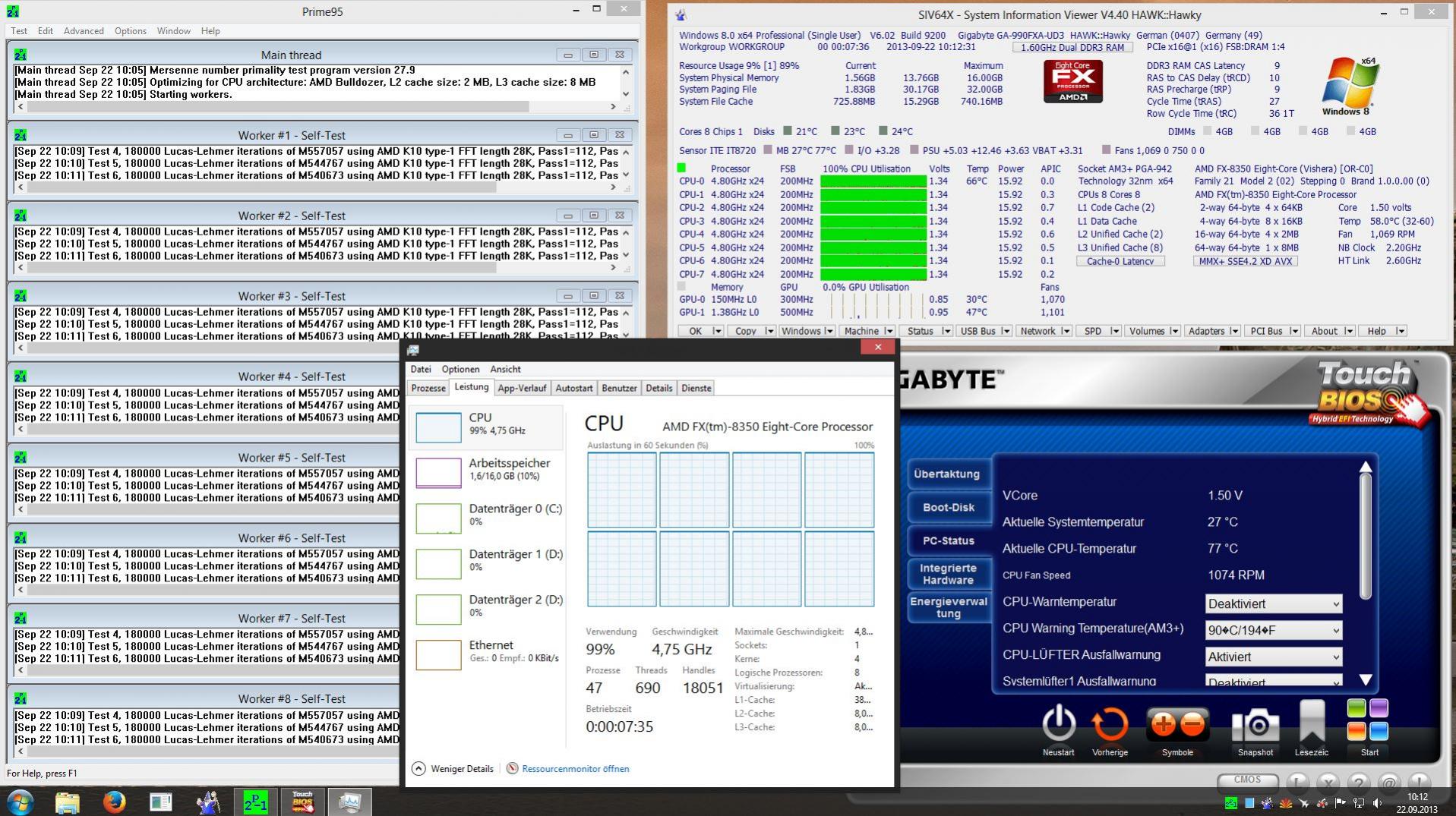 Wollt zwar eigentlich alles auf Standard laufen lassen, da der Intel I7 von meinem Kumpel von diesem Gegrillt wurde (1,6 Volt Vcore mit 90 Grad in Prime), aber es hat mich dann doch zu sehr genervt, das der in far cry 3 andauernd drops auf 46 FPS hatte. Hab jetzt die Spannung bei maximal 1,45 Volt mit einem Takt von 4,8 GHZ. Der CPU läuft jetzt als x4, da es keinen Unterschied macht, ob der als 4 Kerner mit 8 Logischen CPUs oder als x4 läuft (ausser in CPU Benchmarks), außerdem läuft dwer so mit weniger SPannung absolut Stabil, sogar jetzt wo ich im Firefox bin und Prime nebenbei am laufen habe macht der keine Mucken.