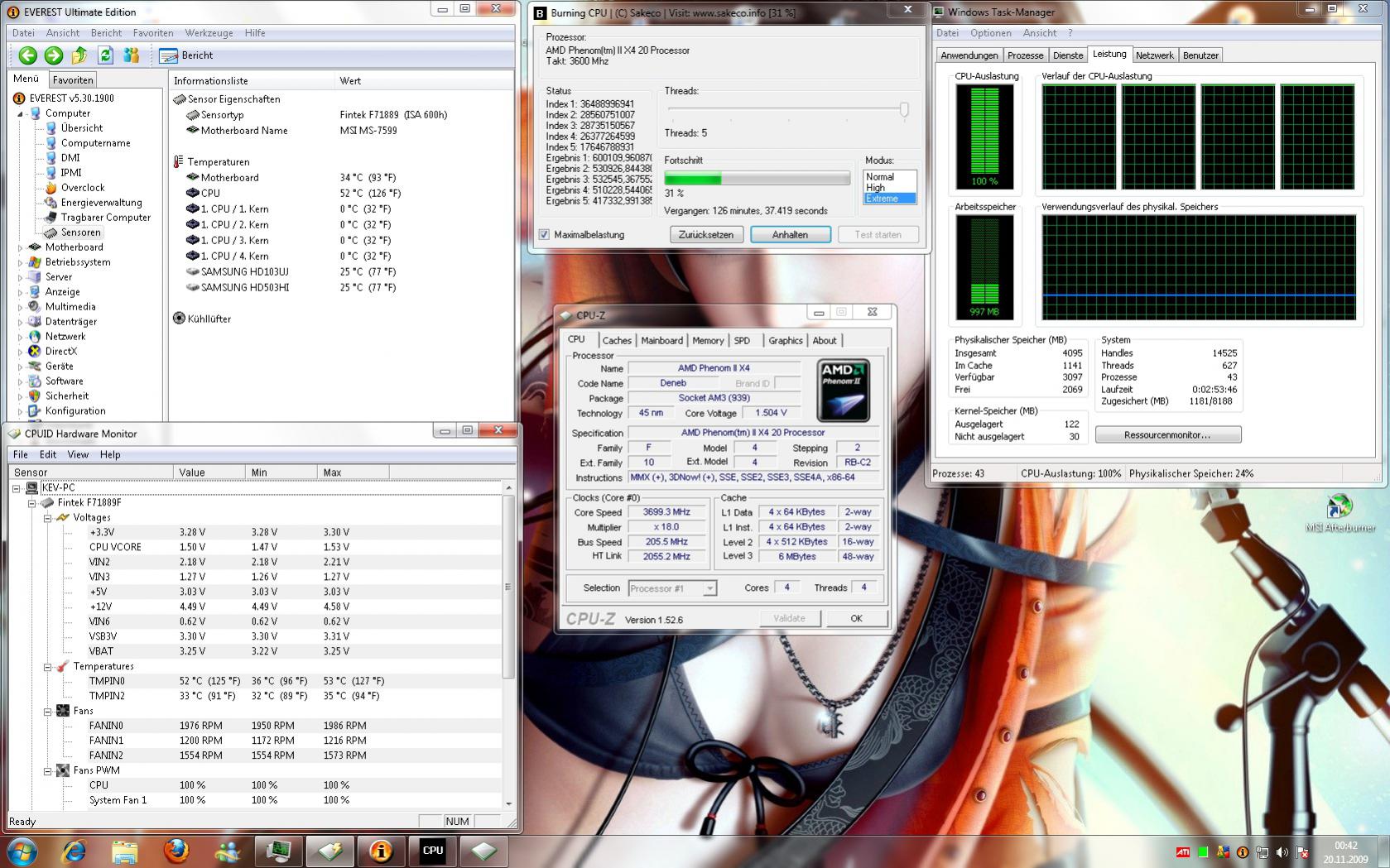 Das mit dem Taskmanager werd ich bei einem ernsthaften Benchversuch natürlich auch so machen. Das war ja nur ein provisorischer Benchversuch, den ich ja dann auch selbst abgebrochen habe, also nix offizielles. Wenn ich die Änderung mit dem CPU-Kühler und dem Seitenteillüfter umgesetzt habe, werde ich mit denselben Werten nochmals primen. Mal sehen wie sich die Temperatur dann entwickelt.