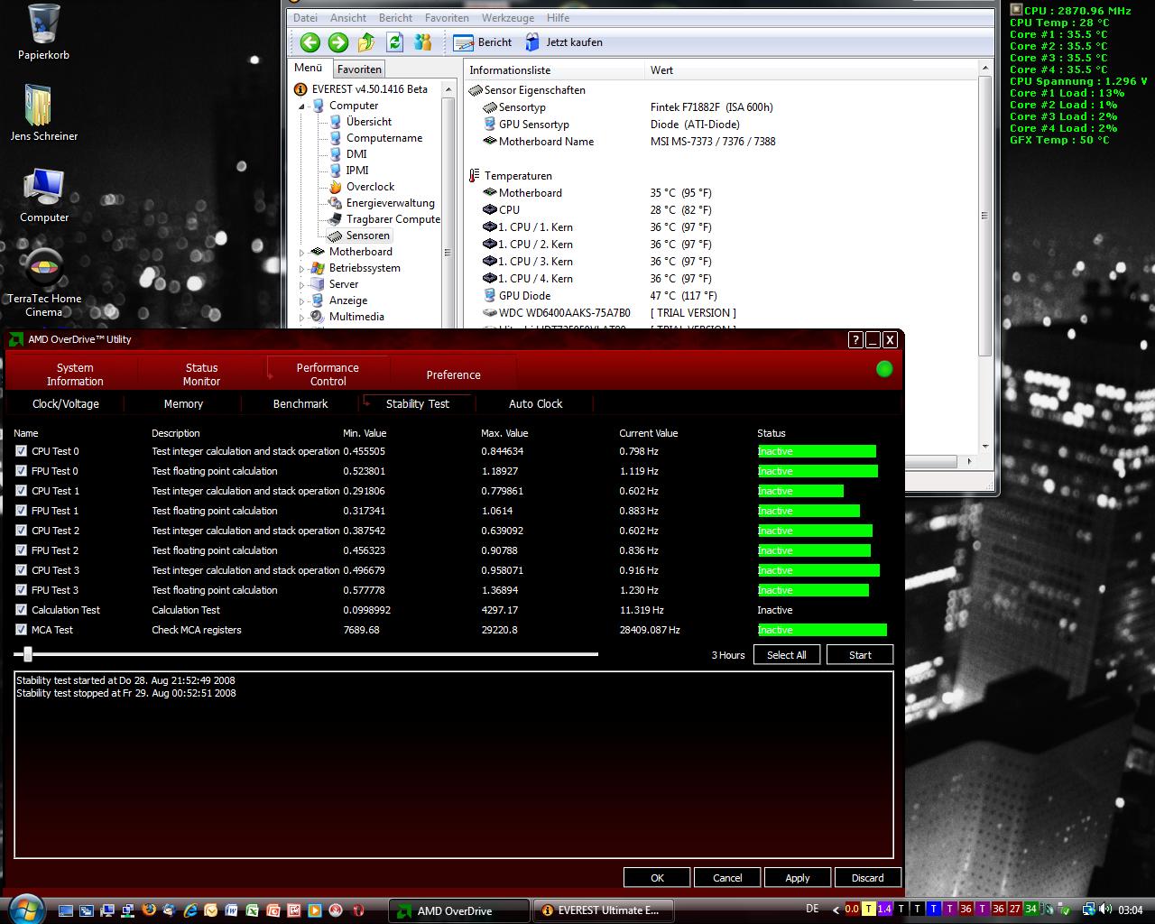 1.2.4 Temperatur; Idle sowie Last (ausgelesen mit Everest!): Surface: 52°C .. Cores Lasse ich weg, da sie scheinbar falsch ausgelesen werden( 68°C mom... 16°C Unterschied is bissl krass...muss nen Messfehler sein)