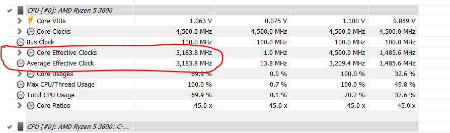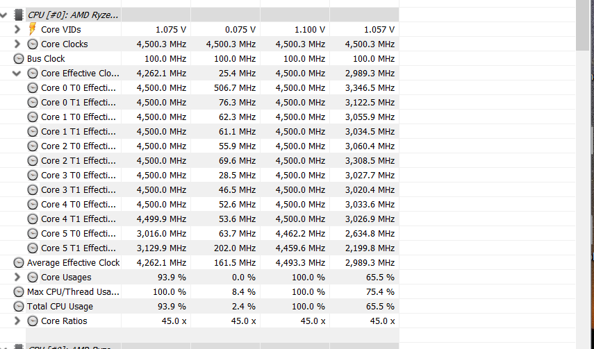 Glücklicherweise habe ich mal Ryzen Master parallel aufgemacht und den Test wiederholt. Siehe da: Ryzen Master meldet den erwarteten Takt von 4-4,1Ghz auf allen Kernen, wogegen Hwinfo steif und fest behauptet, es würfen 4,4Ghz anliegen. Auf stock stimmen die Werte soweit überein, aber mit dem UV ist da eine ordentliche Differenz drin.
