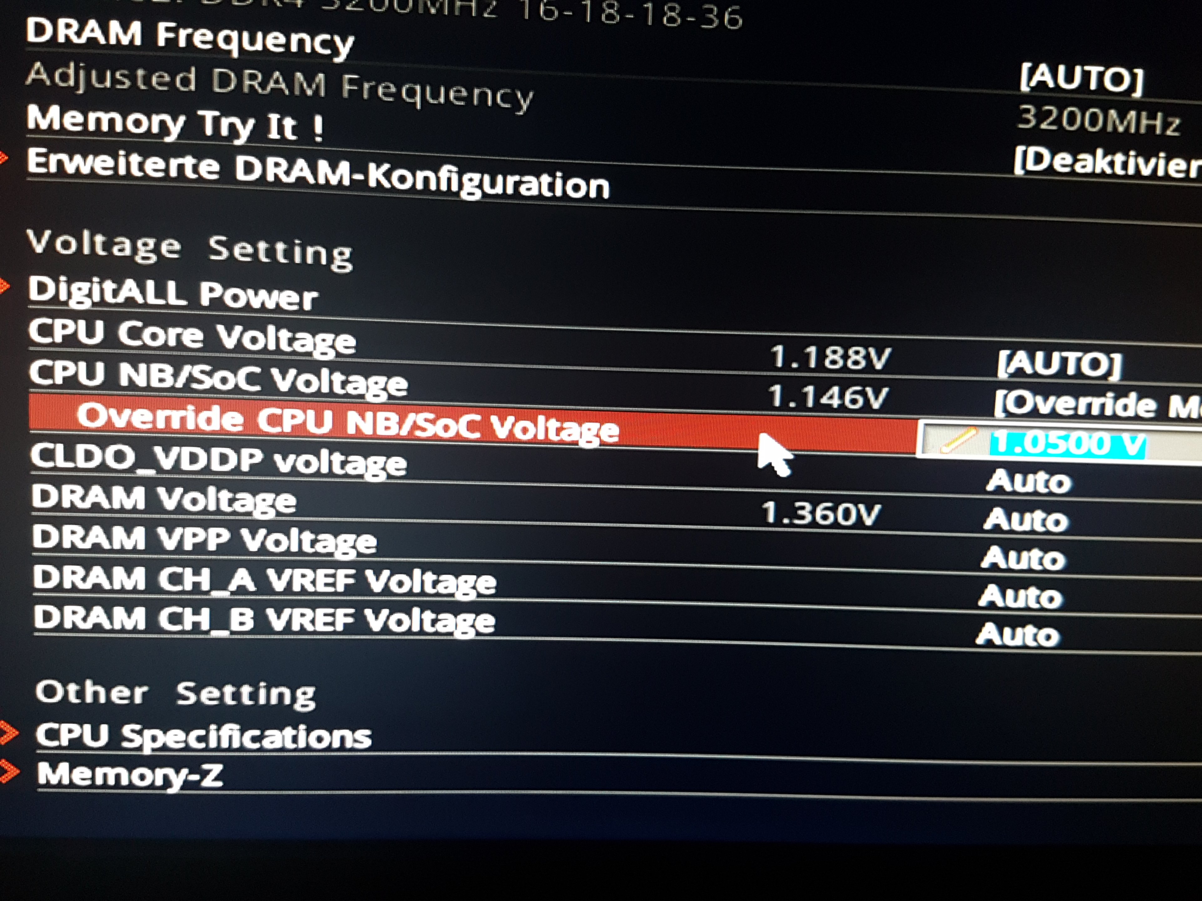 Ich weiß noch genau, dass nach dem OC Versuch mit Ratio x40 mein Rechner hängengeblieben ist. Nach dem Neustart bin ich auf Default mit XMP Profiel 2 3200 und habe (frägt mich nicht warum) SoC Voltage auf 1.05V gestellt!