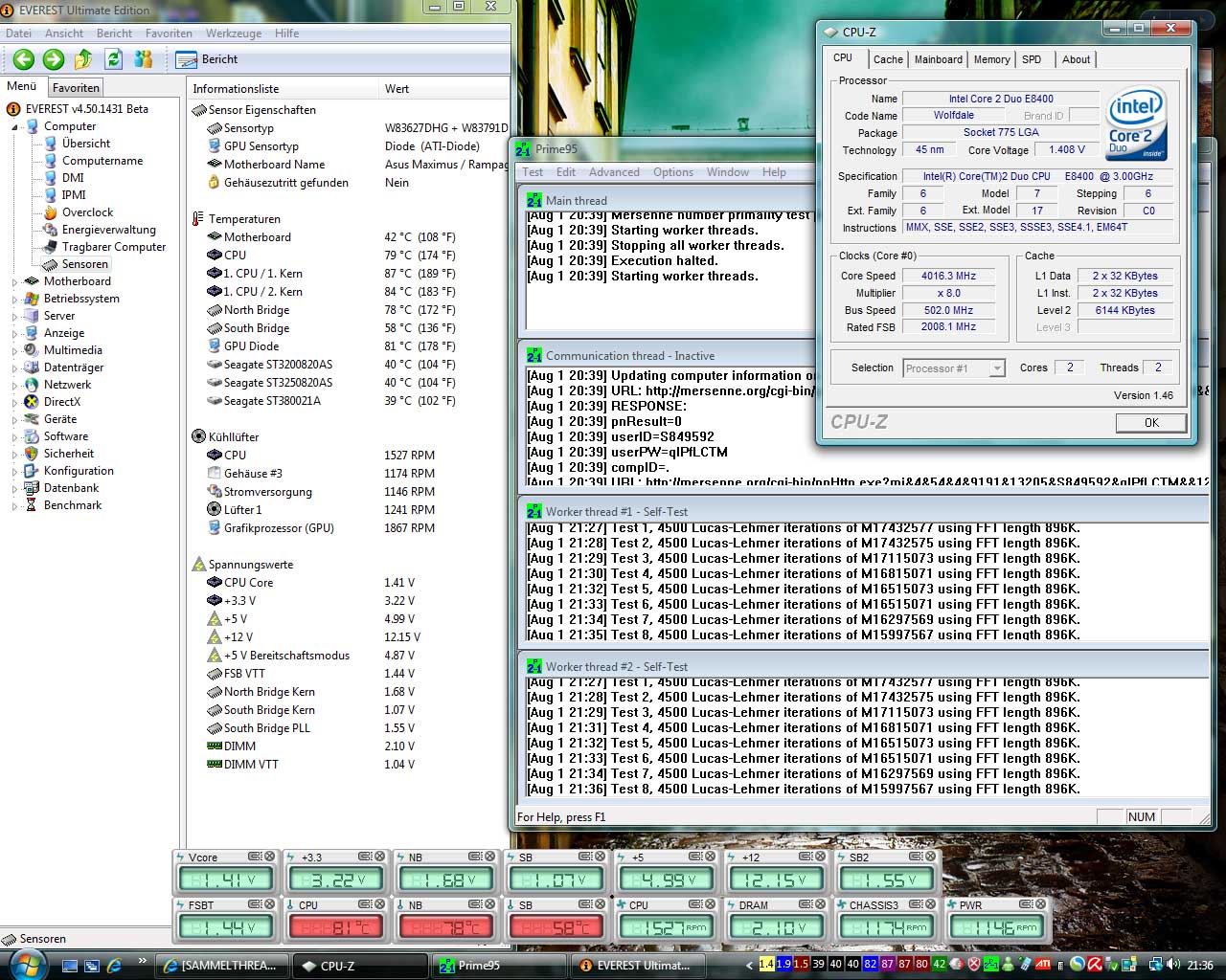 Jetzt mal zu den Spannungen: ich find sie auch etwas hoch, doch lt. verschiedenen Foren ist bei 4GHZ 1,4V Vcore durchaus ok/normal. Weiteres wird die NB-V bei Vollbestückung und bei einem FSB von 500 auf 1,70V angegeben. Somit scheinen die Werte wieder realistisch zu sein ....