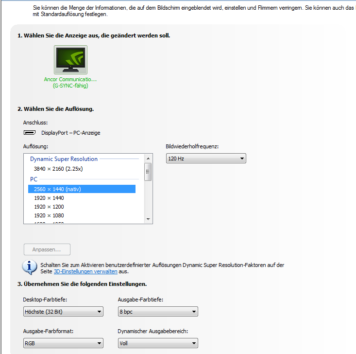 In der Nvidia Systemsteuerung habe ich bei "Bevorzugte Aktualisierungsrate" auf "Höchste verfügbar gestellt" und habe dann auch ingame die 144Hz. Aber wie muss ich das ganze einstellen, dass er im Desktopbetrieb automatisch auf 120Hz runterfährt, so dass auch die Grafikkarte runtertaktet?