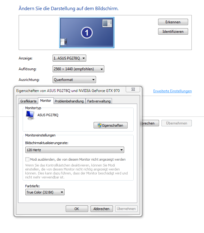 Jetzt spinnt mein Treiber. Obwohl in meinen Spielen 120 Hz eingestellt ist, läuft der Asus immer auf 144. In 2d/Windows dann aber korrekt auf 120 Hz. Hab den Treiber nicht aktualisiert und bin gerade etwas ratlos, wie sowas passieren kann... Hab das Phänomen bei Project Cars, Assetto Corsa und dem ETS2 mal getestet...