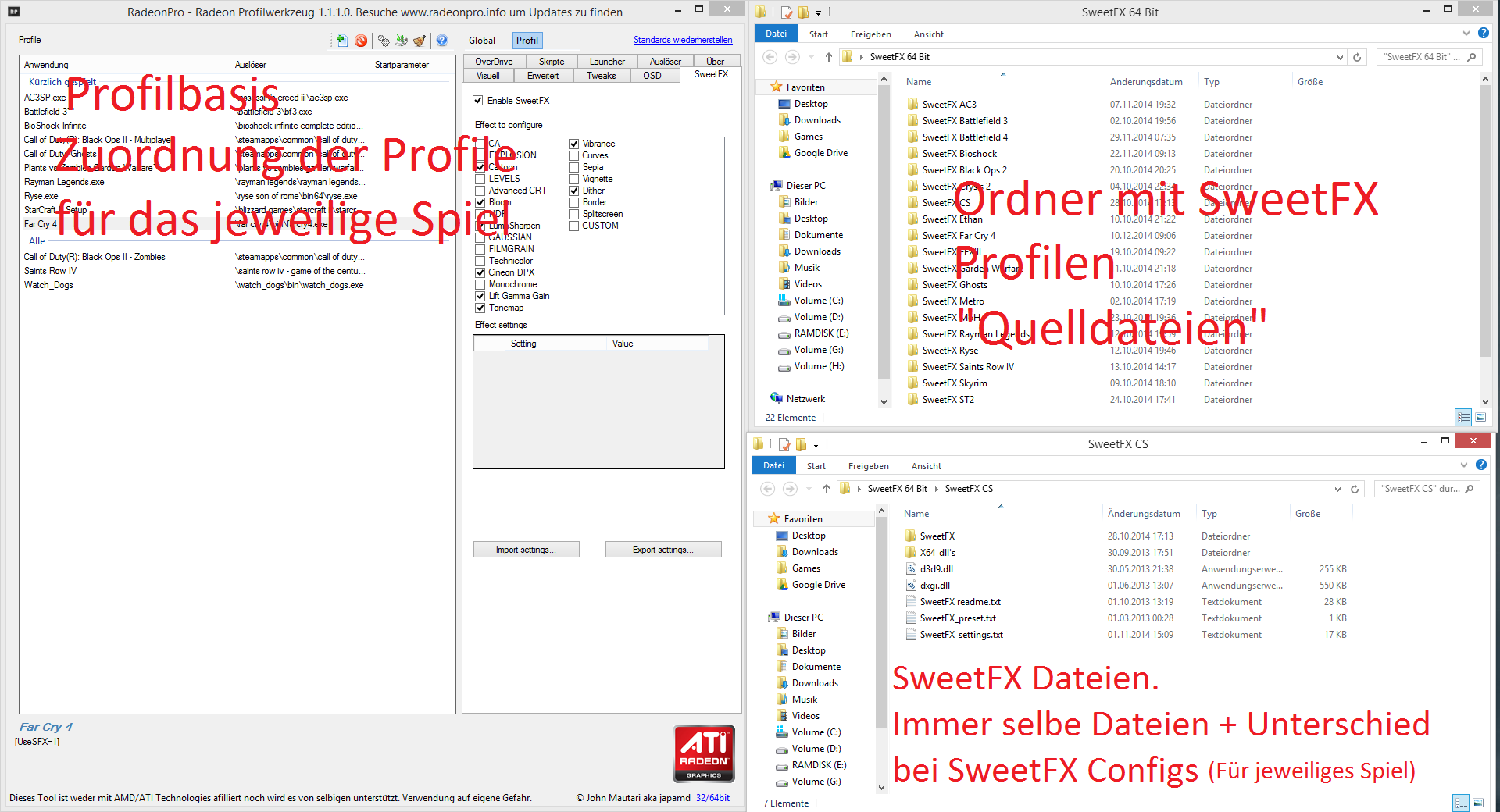 Wichtig ist hierbei: Möchtest du das maximale aus der Grafik herausholen, dann nutze SweetFX. SweetFX ist so gesehen nur ein Farbfilter der vor dem Bild ausgestreckt wird, mit dem positiven Effekt dass das Bild deutlich schärfer wird, den Grauschleier eliminiert und etwas Farbe ins Spiel bringt.