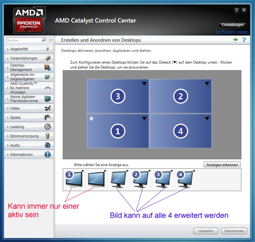Nun seit besagtem Tag funktioniert es einfach nur nicht, habe auch schon diverse CCC Versionen ausprobiert. Ich kann maximal 5 Monitore gleichzeitig "erweitert" laufen lassen, Nummer 6 scheitert. Es wird immer vom CCC erkannt, dass ich 2 Monitore als HDMI angeschlossen habe und 4 als DVI. Von den HDMI kann ich immer nur einen aktivieren, von den DVI alle 4. Was Übergangsweise gar kein Problem darstellt, da ich eh auf 4 Monitore reduzieren wollte. Damit kann ich mir so eine 4-er Gruppe zusammenbasteln (2x2) und gut mit arbeiten (Arbeits-PC, kein Computerspieler). Es müssen allerdings immer +1 Monitor angeschlossen sein, da die ersten beiden Monitore immer als HDMI erkannt werden und ich da eben nur einen aktivieren kann.