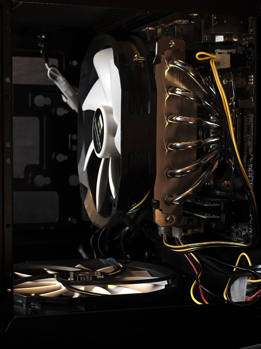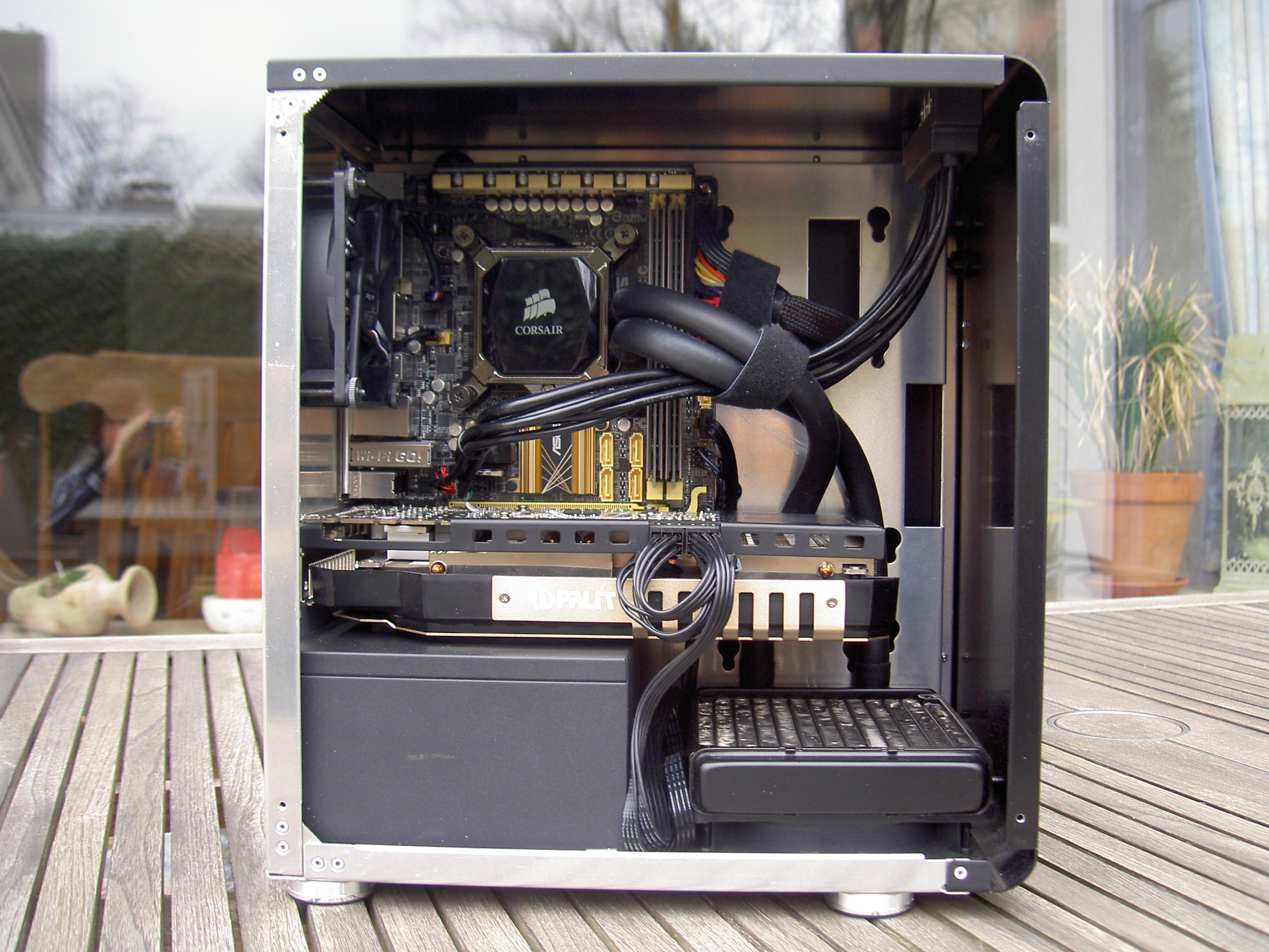 Corsair Air 540 mit 5x140mm be quiet! Silent Wings 2, Intel i7 4770K mit be quiet! Dark Rock Pro 2 Kühler, Asus Sabertooth Z87 Mainboard, 16 GB DDR3 RAM, 2x Manli Caseking GTX970 mit EVGA SLI Bridge, 256GB 840 Pro und 1TB 840 Evo SSD, Corsair RM650 Netzteil, Asus Xonar DGX Soundkarte.