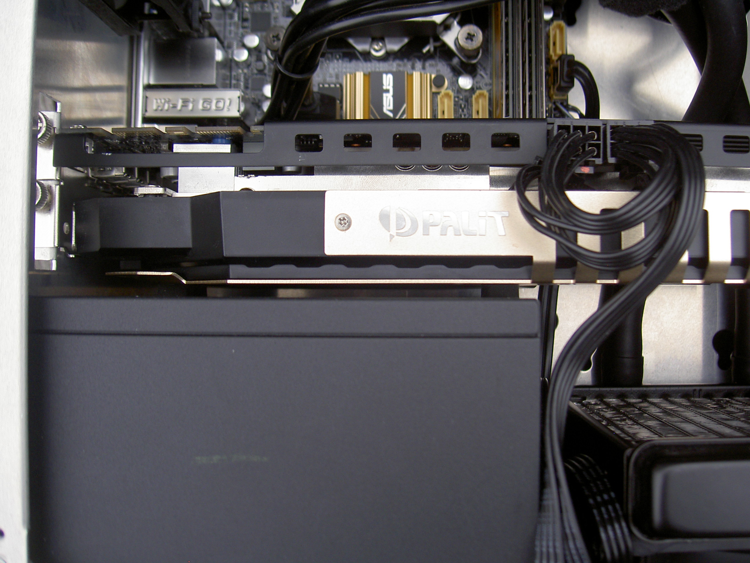 Wie man sieht, hat die 2,5 Slot Karte eigentlich nicht mehr wirklich ins System gepasst. Musste den Staubfilter unterm Netzteil entfernen und die Spacer aus dem Gehäuse brechen, damit hab ich ca. 3 mm gewonnen, so dass die Graka dann nicht auf dem Netzteil liegt. Außerdem zwischen Grafikkarte und Netzteil die Spacer wieder eingeklebt, so dass ca. 3 mm Abstand gewahrt sind.