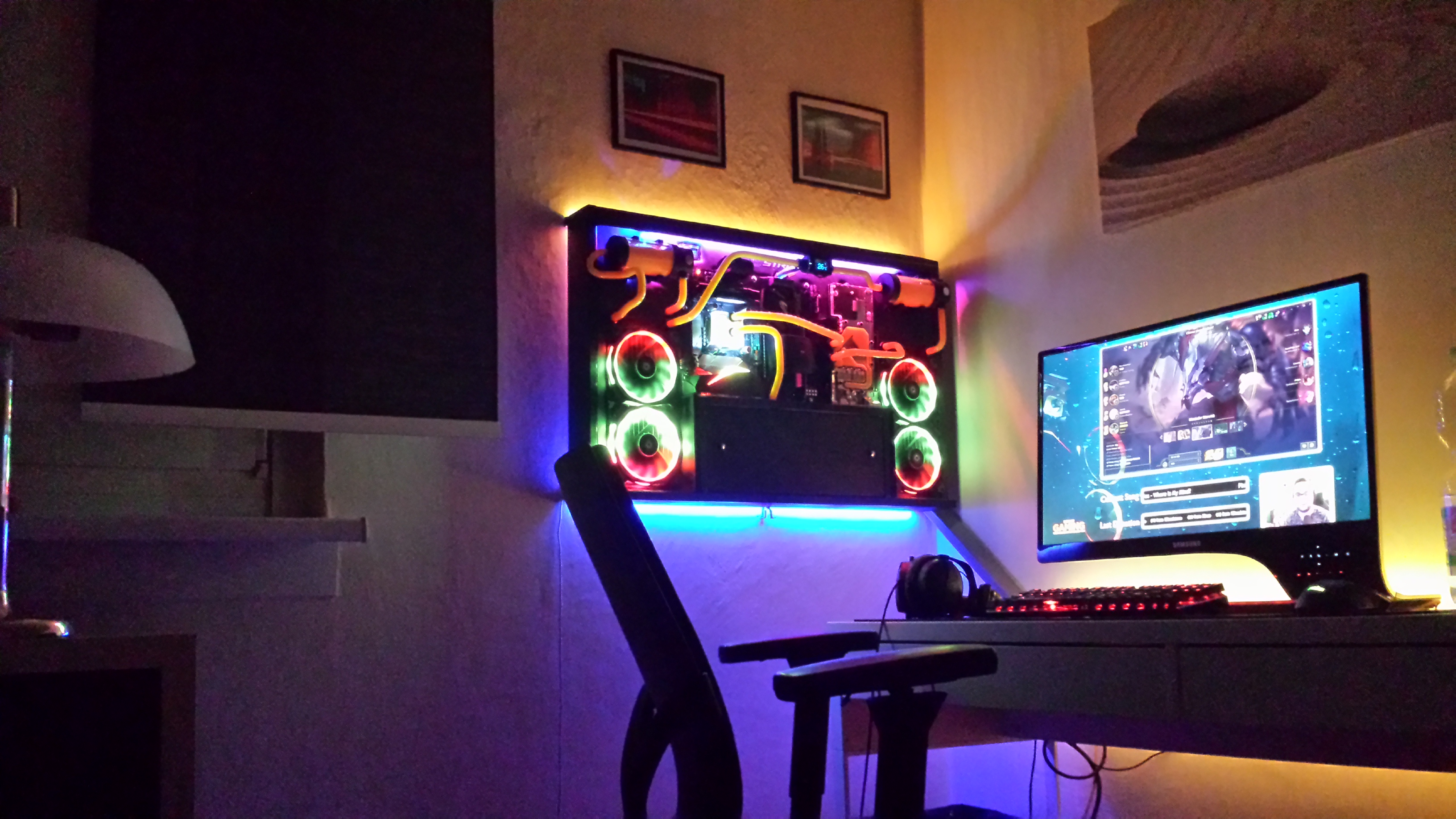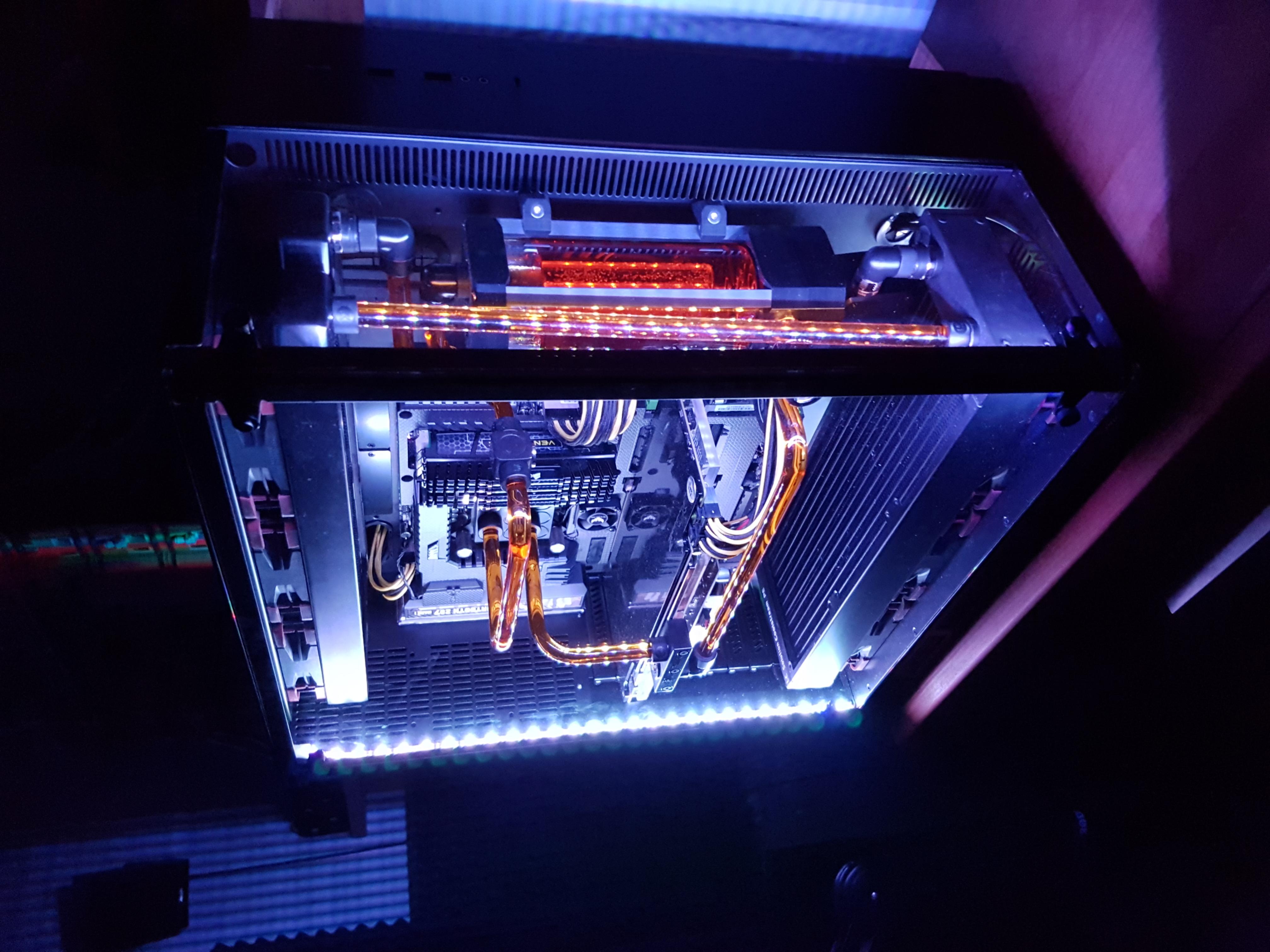 Das System läuft derzeit bei 4,6Ghz @1,36 (geköpft + Flüssigmetall) unter Prime auf 58°. Die GPU binde ich erst bei einem neuen Gehäuse mit ein, da ich in der Front keinen Platz mehr für einen 360er Radiator habe und es für meine 1080 leider keinen geeigneten Kühler von Watercool gibt (EK gefällt mir nicht). Habe das Ganze eigentlich mehr aus optischen Gründen gemacht