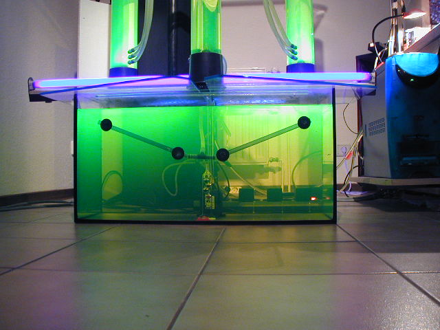 Als Radiatoren sind ein Watercool MoRa 420 mit 9x140 mm Lüftern sowie ein Phobya Nova 1080 mit 9x120 mm Lüftern vorhanden. Beim Phobya sind im Leerlauf die Lüfter aus; beim MoRa drehen sie mit 250 U/min. Über einen Zweipunktregler ist die Wakü so eingestellt, dass ab 4 K Differenz zwischen Wasser- und Raumtemperatur die Pumpe schneller läuft, die Lüfter des MoRa auf 400 U/min beschleunigen und die Lüfter des Phobya Nova anfangen zu arbeiten (mit 500 U/min). Damit bleibt die Wassertemperatur unter Last bei ca. 3 K über der Raumtemperatur.