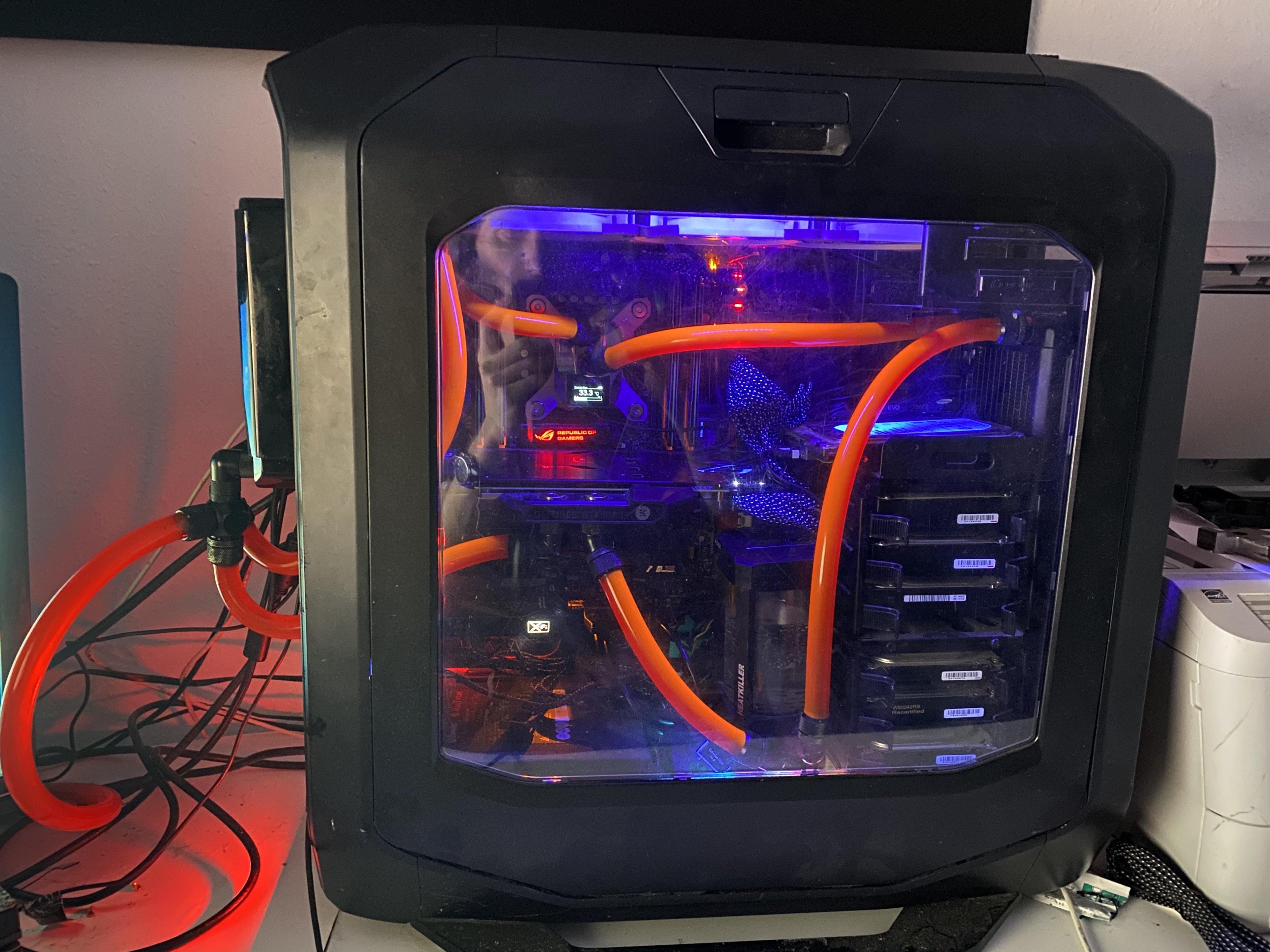Hab heute endlich mal den Bohrer in die Hand genommen, das Corsair Graphite 780T ist ja fast doch etwas zu klein mit den HardwareLabs Radiatoren und die 2 Radis, die nicht passten, vom Schreibtisch ins Case verfrachtet: