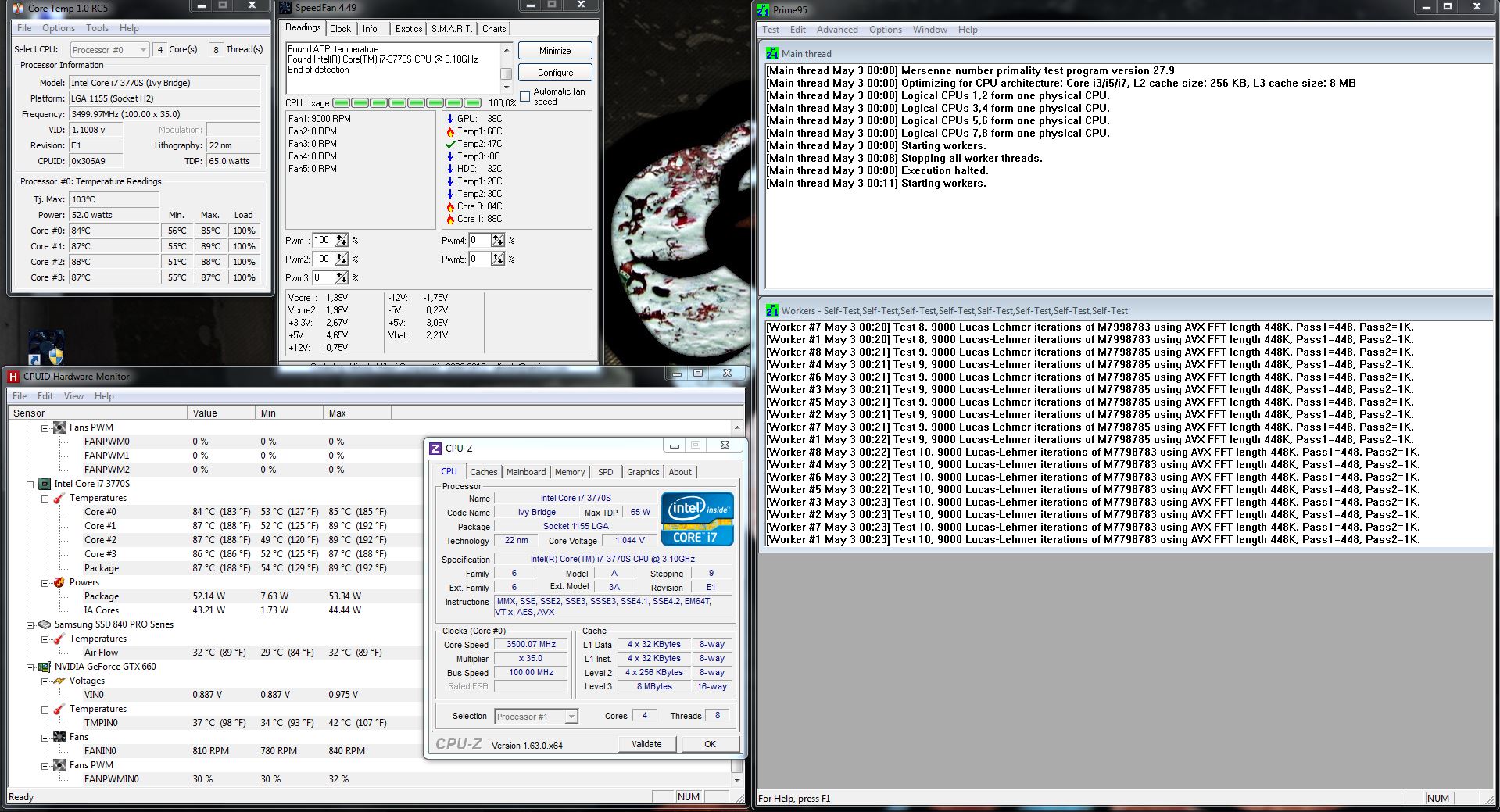 Nun habe ich alles installiert im Coolcube (keine Gehäuselüfter, alles geschlossen), und im Screenshot die Temperaturen angehängt (CPU Max. Temp. bei um die 90 Grad). Alles läuft in Stock Speeds, ich habe an nichts herumgedoktored, die Spannung weder hoch- noch runtergesetzt. Beim Einbau habe ich lediglich darauf geachtet, dass keine Kabel oder sonstwas zwischen dem Netzteil-Lüfter (bläst auf CPU) und dem CPU-Lüfter sind. Und ich habe auch den Lüfter der GPU versucht freizuhalten. Das SSD wird auf von keinen Kabeln berührt. Eine Kabel des Netzteils musste ich schon etwas knicken, damit sie reinpassen, aber nichts allzu dramatisches.